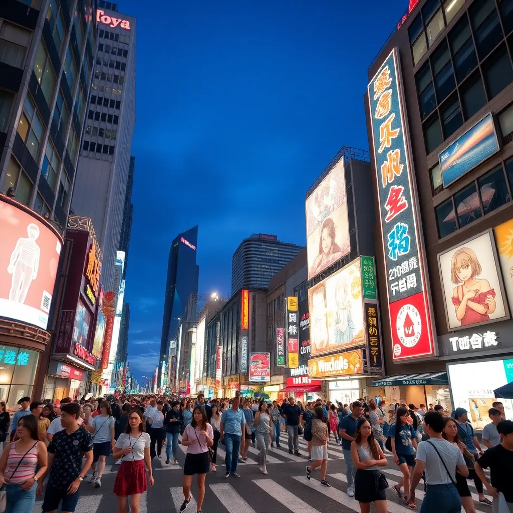 Imagine a sweltering summer evening in Tokyo's Shibuya Crossing. Neon lights dance across the pavement as people of all ages and styles mingle and take in the vibrant atmosphere. Capture the essence of this iconic intersection, with its towering skyscrapers, bustling streets, and the promise of a night out.