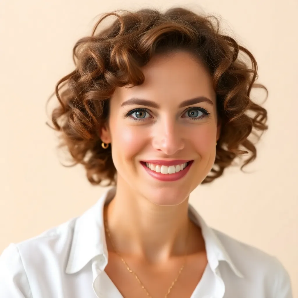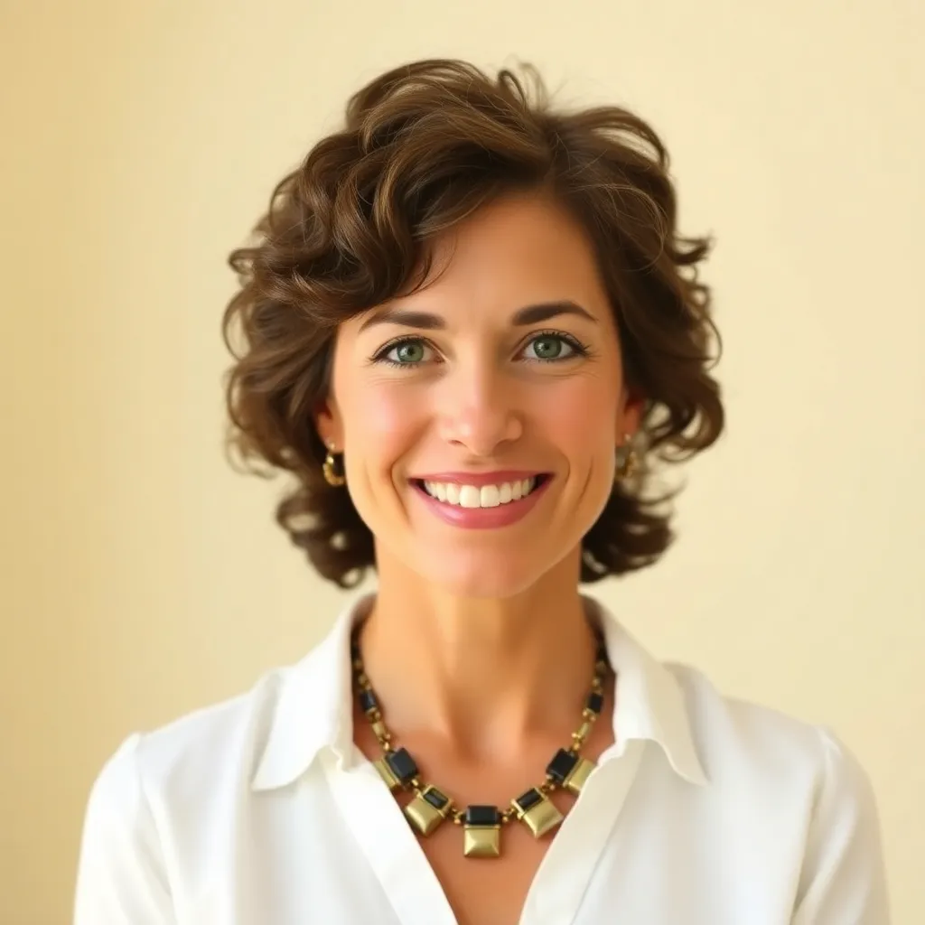 Create a professional headshot of a teacher with a warm and approachable smile. She has short, curly brown hair and bright green eyes. She's wearing a crisp white blouse and a statement necklace. The background is a soft, creamy color. The lighting is natural and flattering, with a slight golden glow.