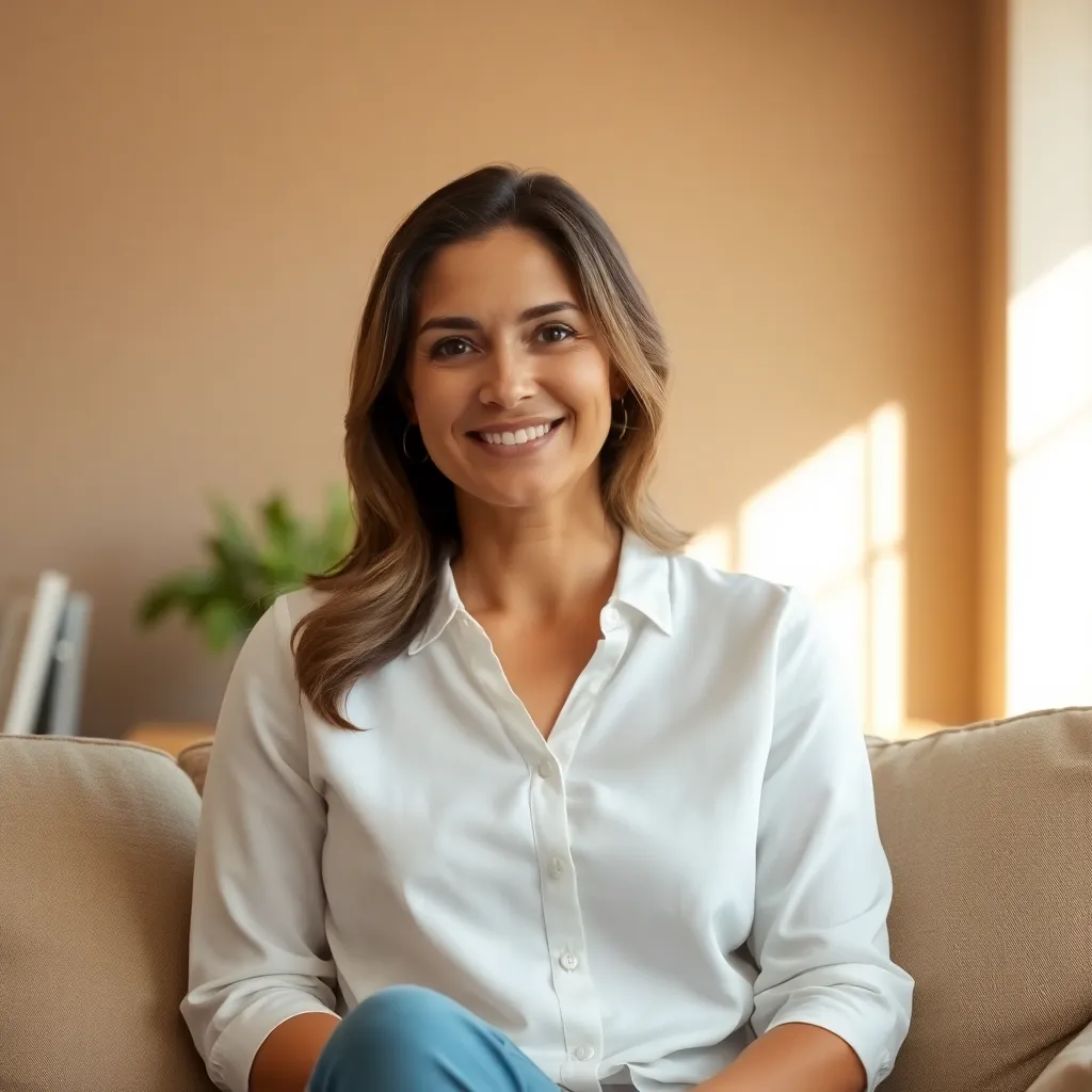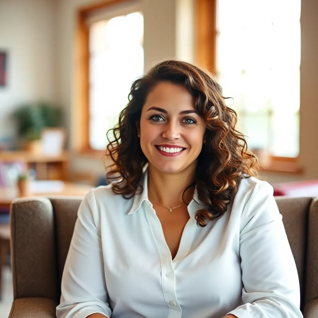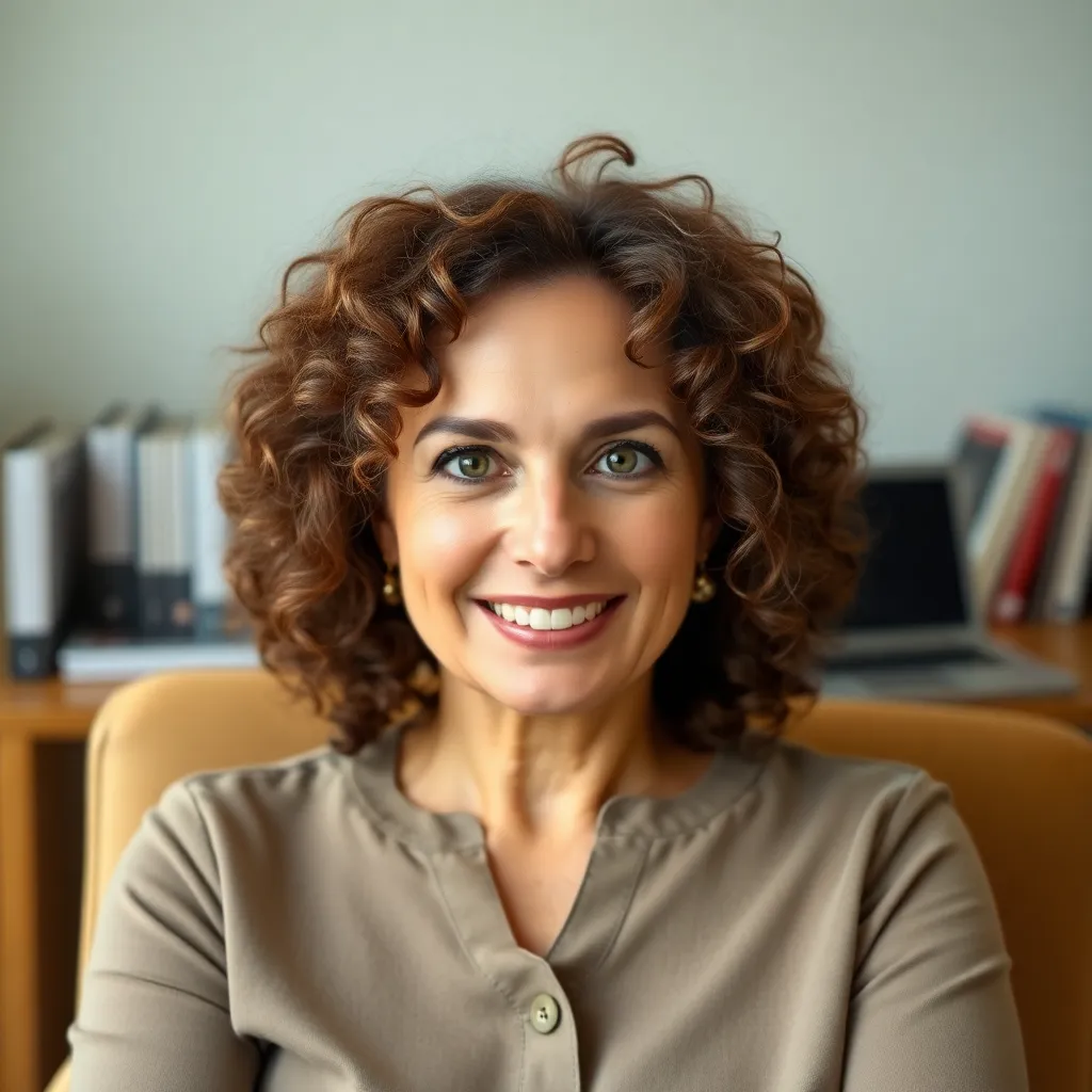 Create a professional teacher headshot. Imagine a warm and inviting atmosphere. The teacher, a middle-aged woman with curly brown hair and a kind smile, sits in a comfortable chair with a subtle background of books and a laptop. She looks directly at the camera with a confident and approachable demeanor.