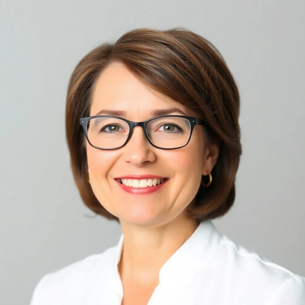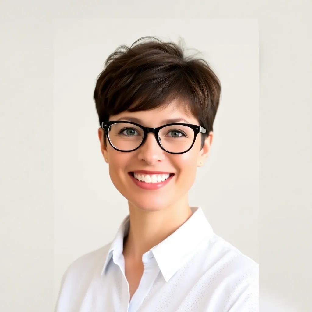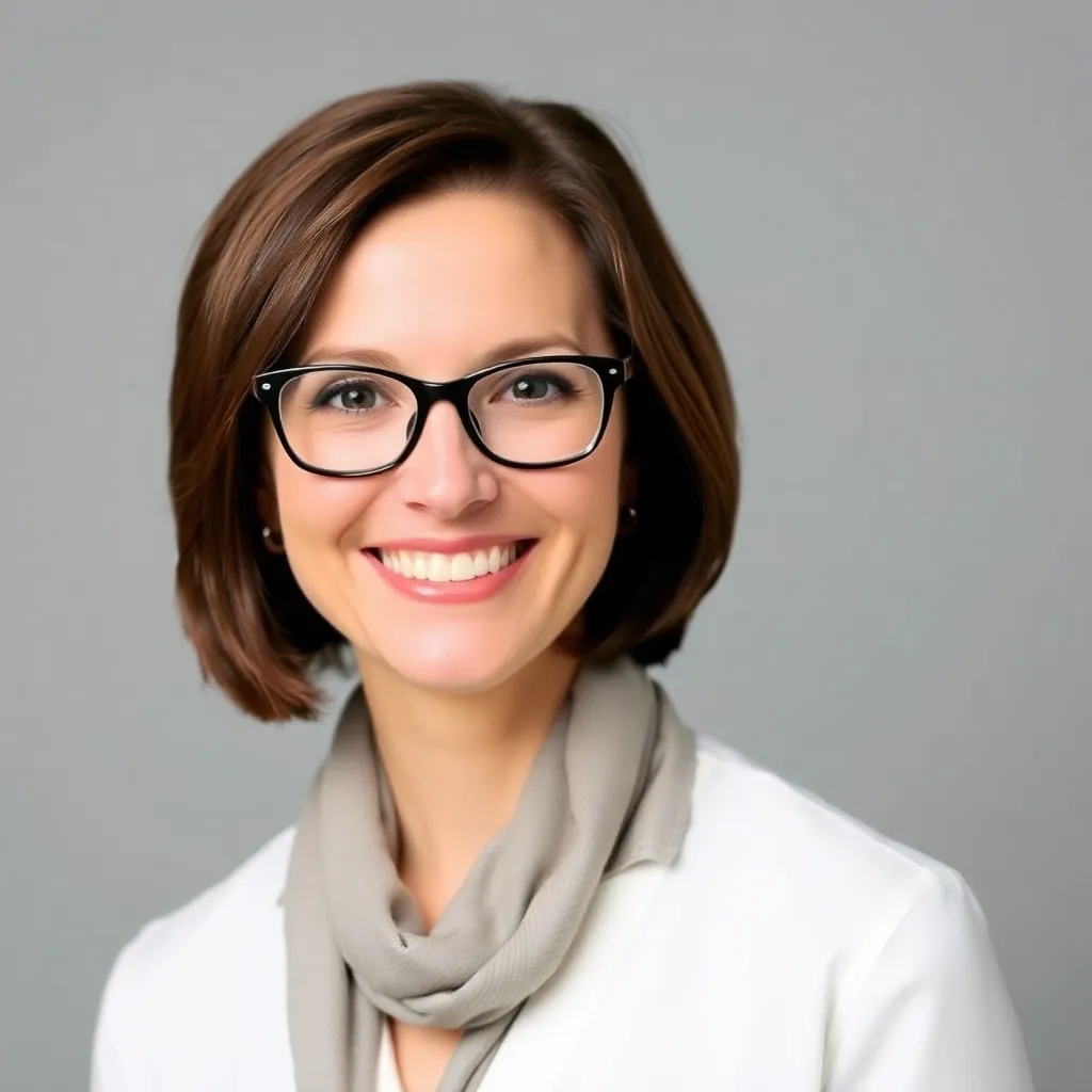 Create a professional teacher headshot. Imagine a warm and inviting smile, framed by a pair of stylish glasses. A crisp white or light-colored blouse and a statement necklace add a touch of elegance. Hair is neatly styled, and the background is a soft, neutral color. What does the teacher look like?