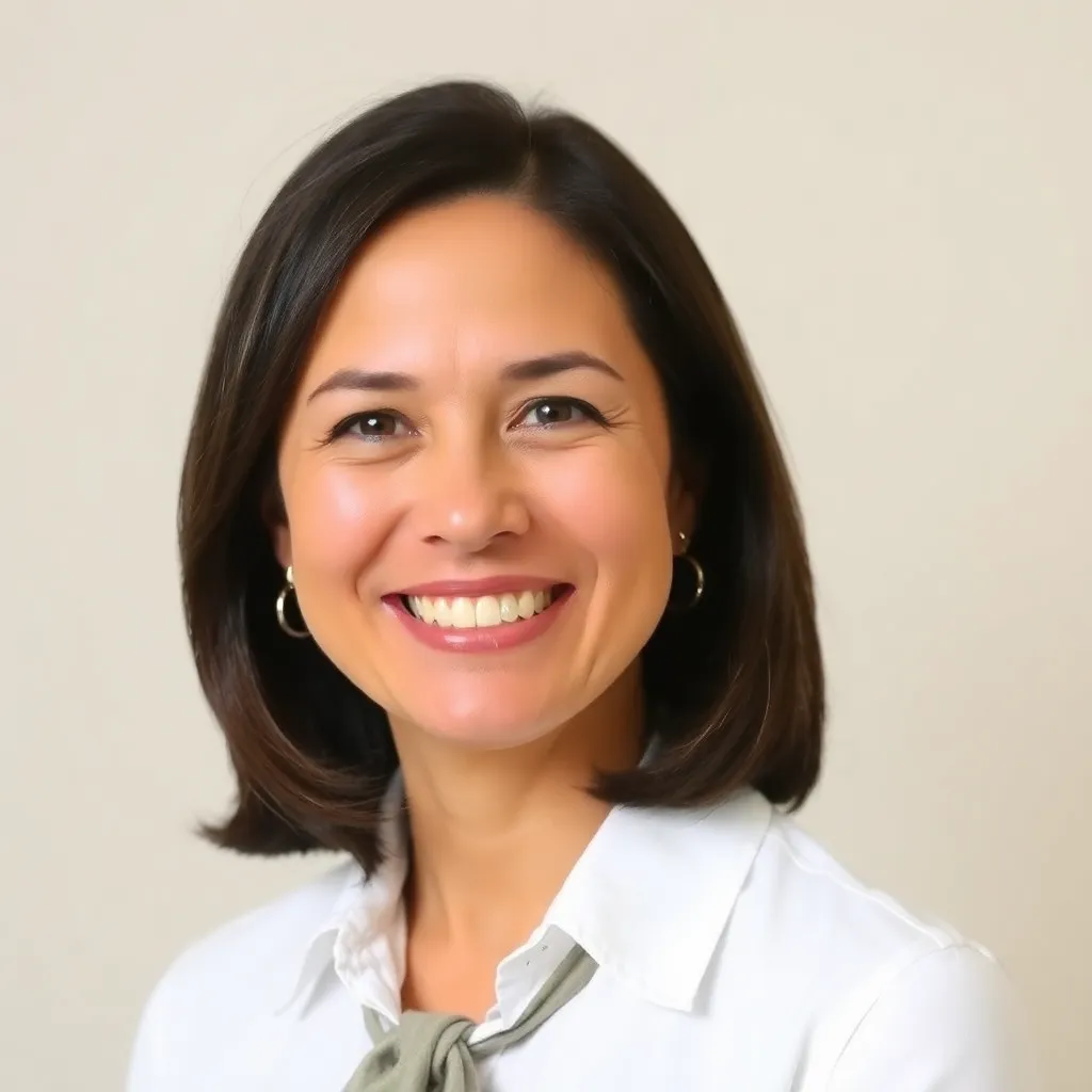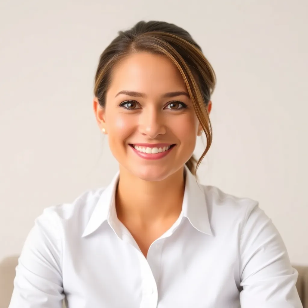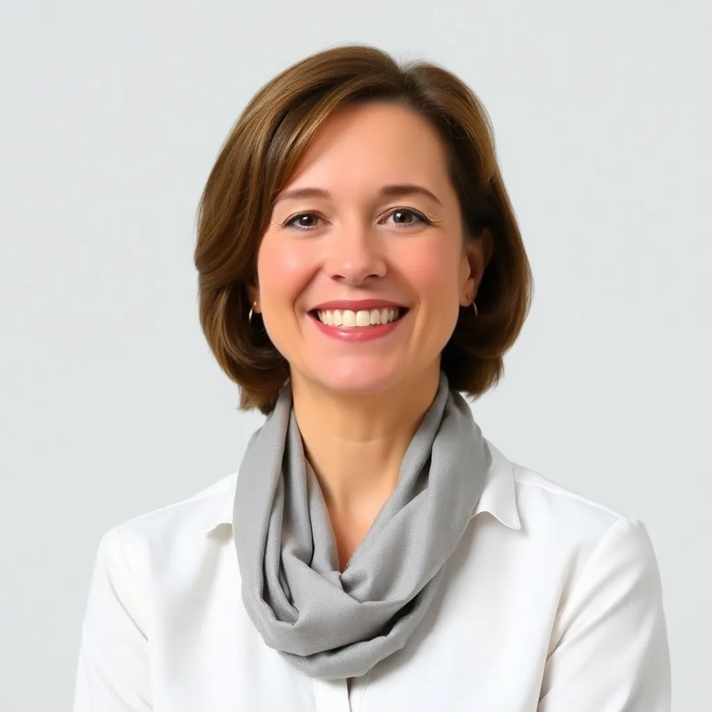 Create a professional teacher headshot with a warm and approachable smile. Imagine a bright, natural-light-filled room with a subtle background. The teacher, dressed in a crisp white or light-colored blouse, looks directly at the camera with a gentle, yet authoritative gaze. The image exudes trust, wisdom, and dedication to education.