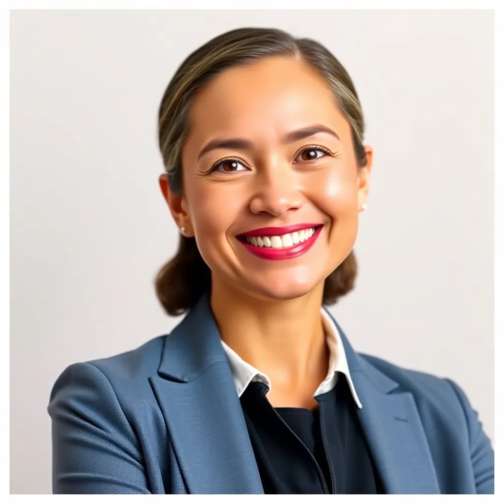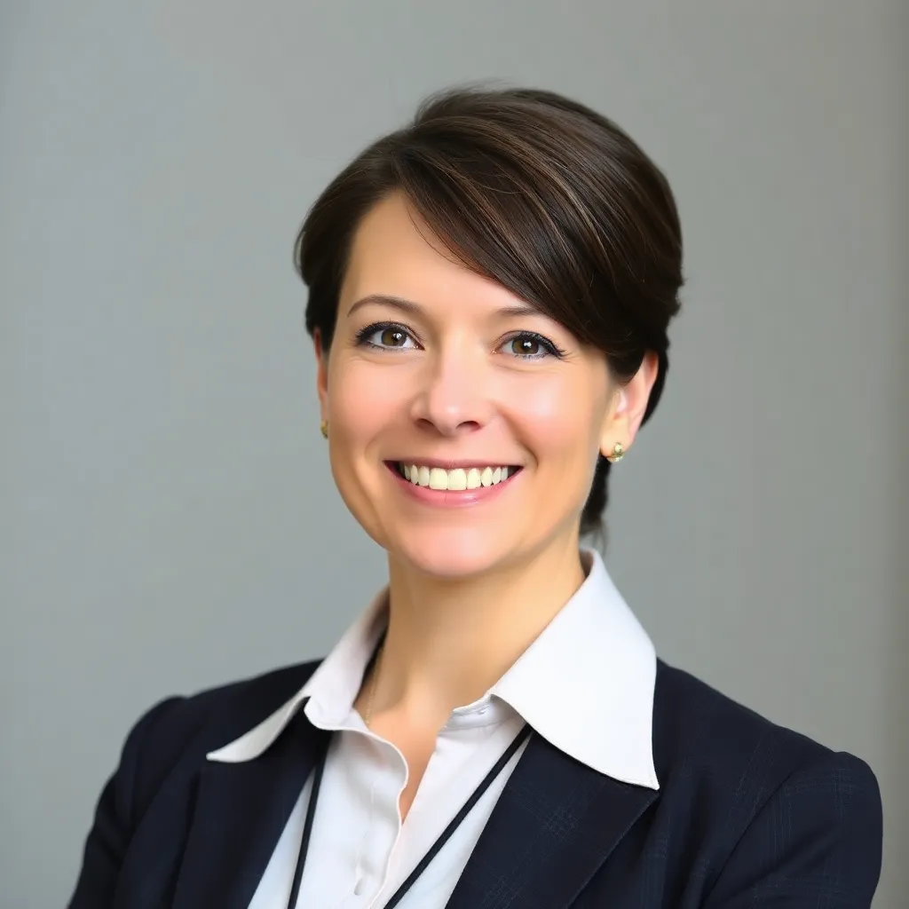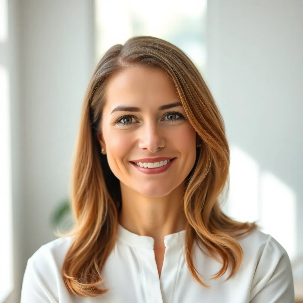Create a professional teacher headshot with a warm and approachable smile. Imagine a bright, natural-light-filled room with a subtle background. The teacher, dressed in a crisp white or light-colored blouse, looks directly at the camera with a gentle, yet authoritative gaze. The image exudes trust, wisdom, and dedication to education.