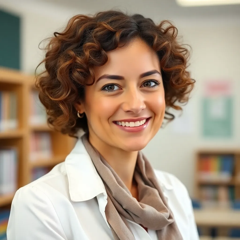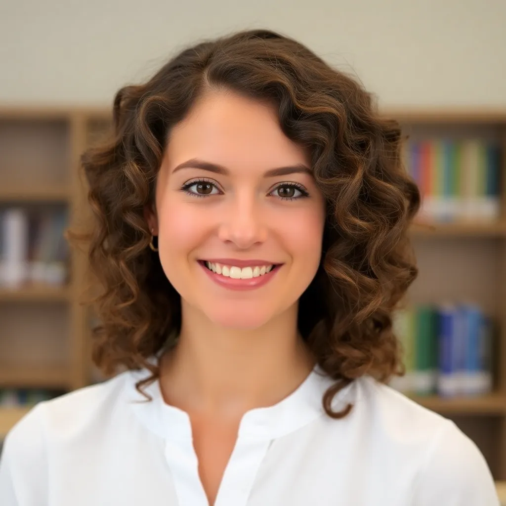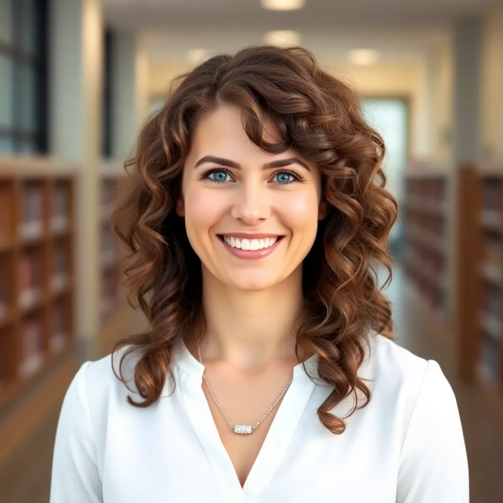 Create a warm and approachable teacher headshot. Imagine a smiling woman with curly brown hair and bright green eyes, wearing a crisp white blouse and a statement necklace. She's sitting in a cozy library with a stack of books and a warm lamp in the background, conveying a sense of professionalism and kindness.