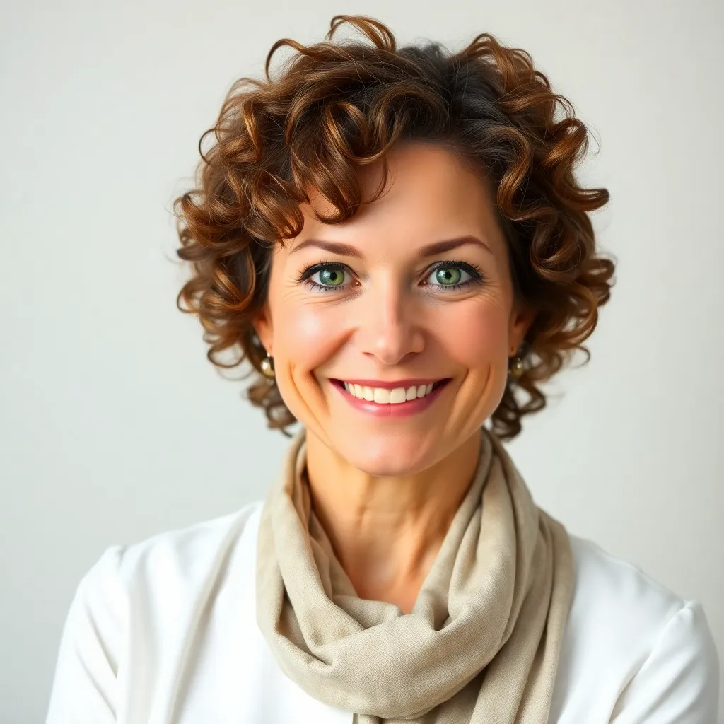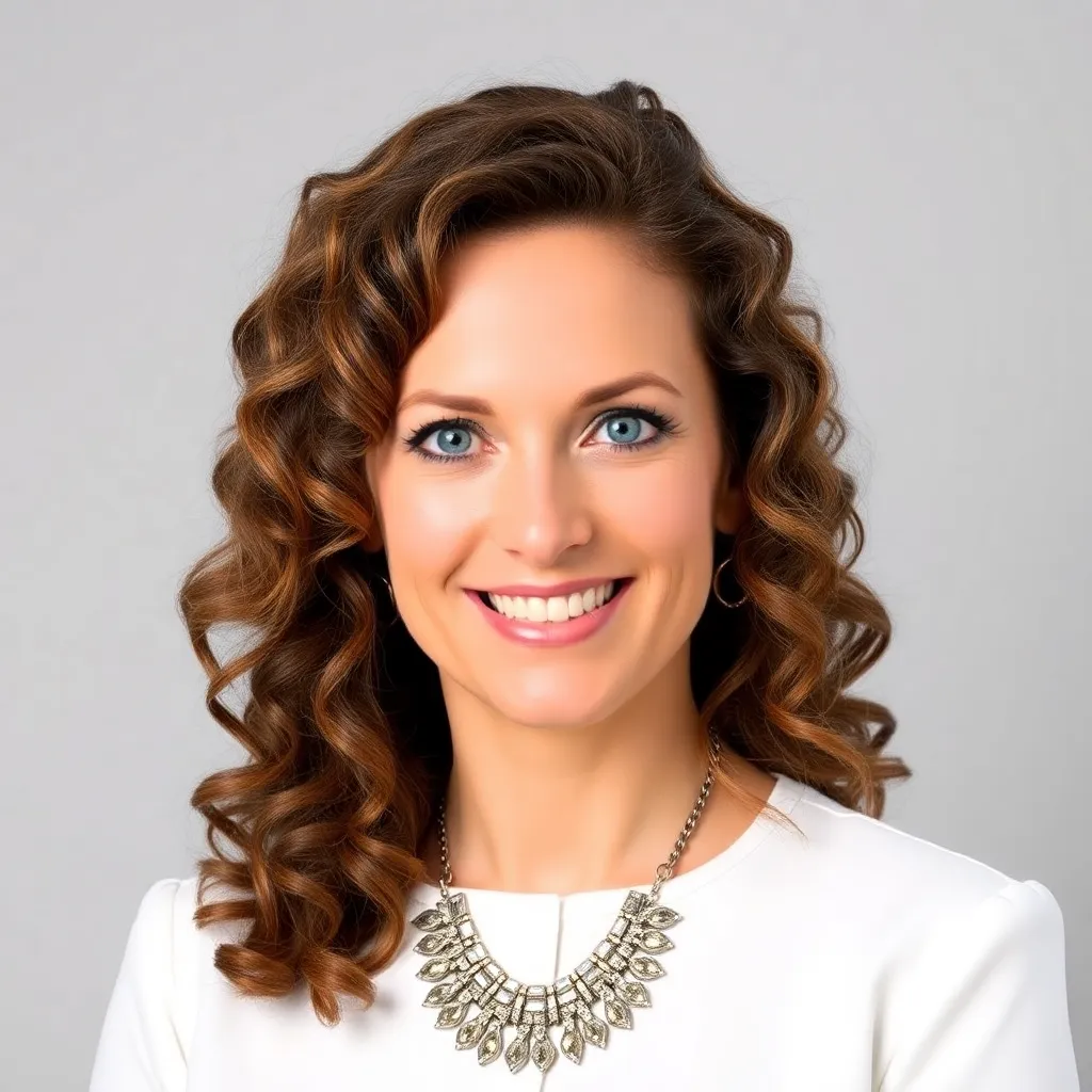 Create a professional teacher headshot for a dedicated educator. The subject is a middle-aged woman with short, curly brown hair and warm, hazel eyes. She's wearing a crisp white blouse and a statement piece of jewelry. The background is a neutral, soft gray. The overall feel is approachable and authoritative.