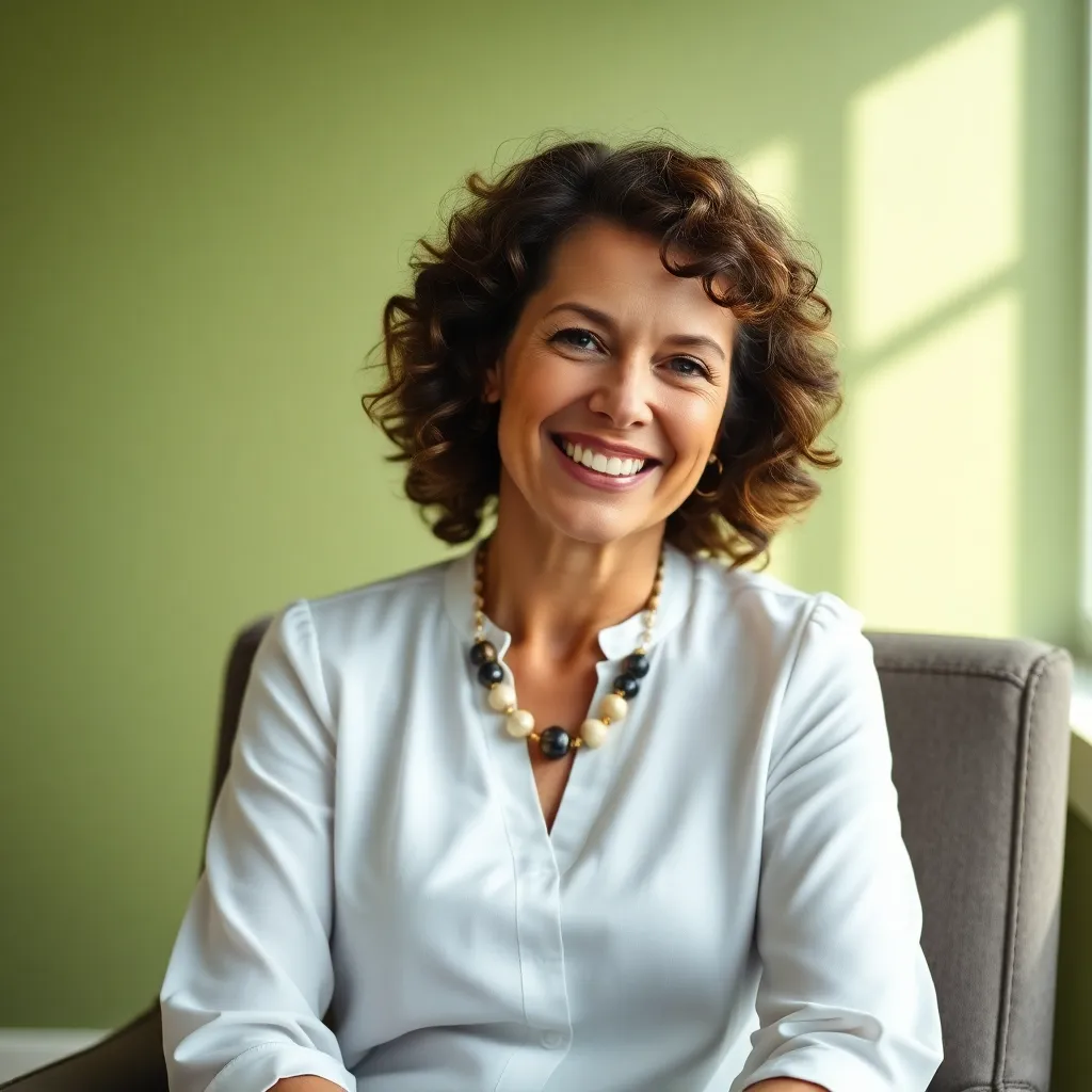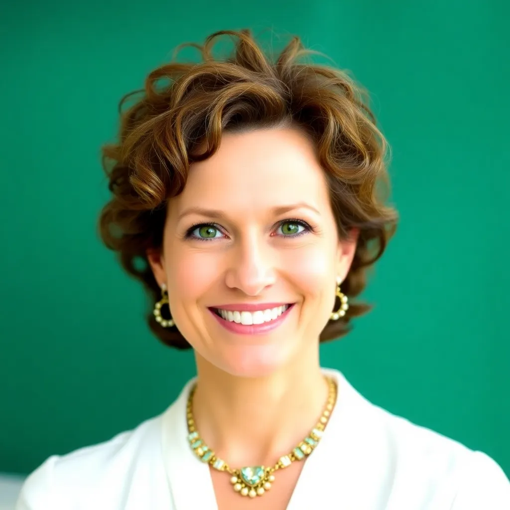 Create a professional teacher headshot. Imagine a warm and inviting setting, with soft natural light. The teacher, a middle-aged woman with curly brown hair and a bright smile, sits in a comfortable chair. She wears a crisp white blouse and a statement necklace. The background is a calming, muted green.