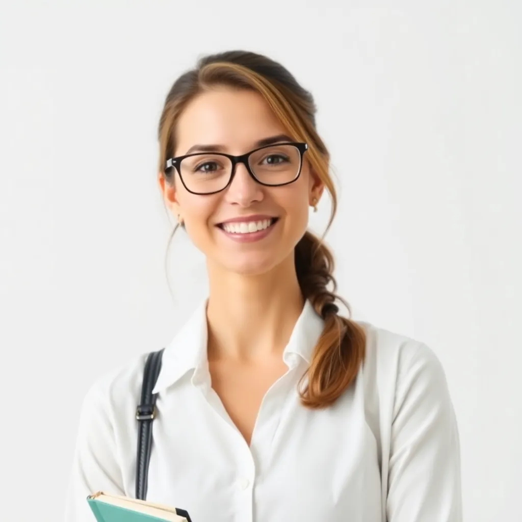 Create a professional teacher headshot for a high school English literature teacher. The subject is a 35-year-old woman with short brown hair, warm smile, and glasses. She's wearing a crisp white blouse and a simple silver necklace. Style the image with a soft, natural light and a clean, minimalist background.