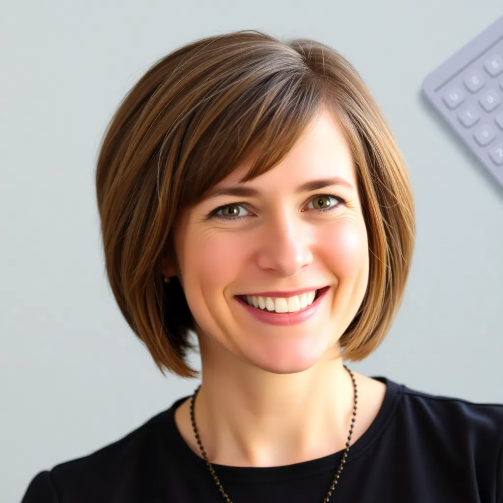 Create a professional teacher headshot for a middle school math teacher, Emma Thompson, with short brown hair, warm smile, and a friendly demeanor. Incorporate a subtle math-inspired background, such as a geometric pattern or a faint image of a calculator, to showcase her passion for teaching and math.