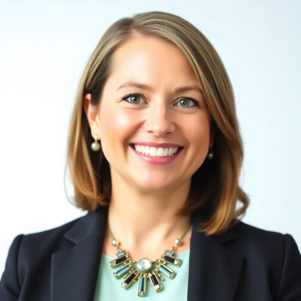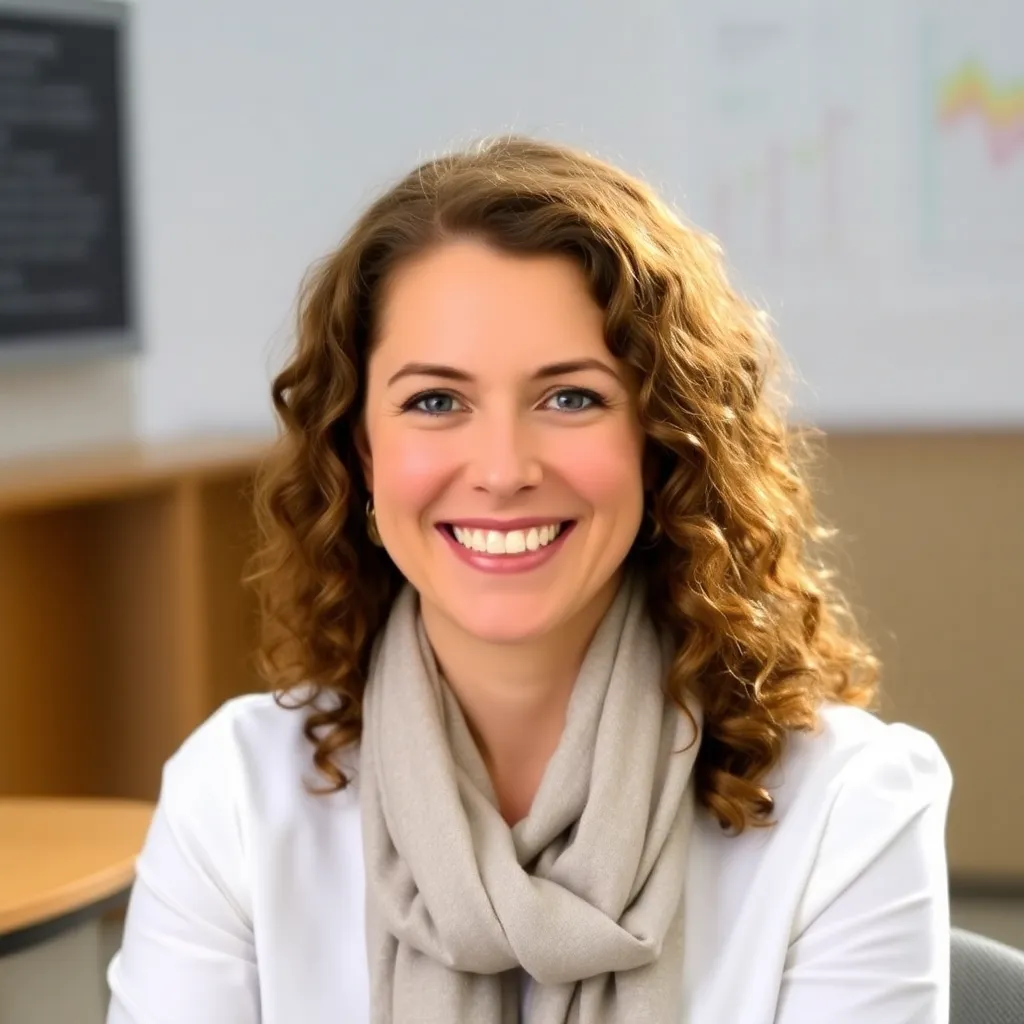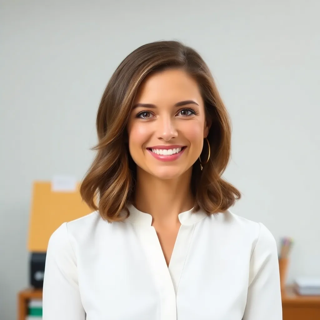 Create a professional teacher headshot with a warm and approachable smile. Imagine a bright, airy classroom with natural light pouring in. The teacher, dressed in a crisp white blouse and a statement piece of jewelry, sits comfortably with a subtle pose, exuding confidence and kindness. Generative AI, please bring this image to life!