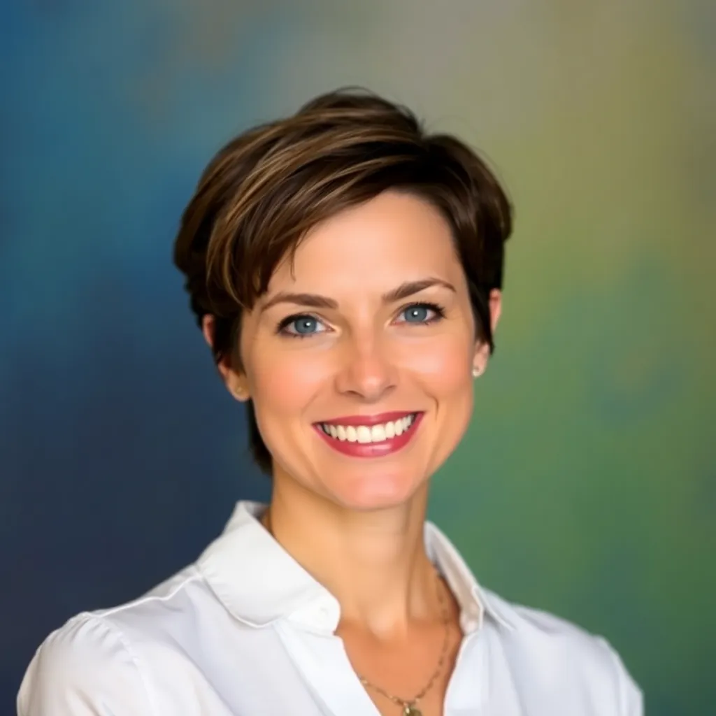 Create a professional headshot for a teacher, showcasing a warm and approachable smile. The subject is a woman in her mid-30s with curly brown hair, wearing a crisp white blouse and a simple yet elegant necklace. The background is a soft, blurred gradient of blues and whites, evoking a sense of trust and authority.