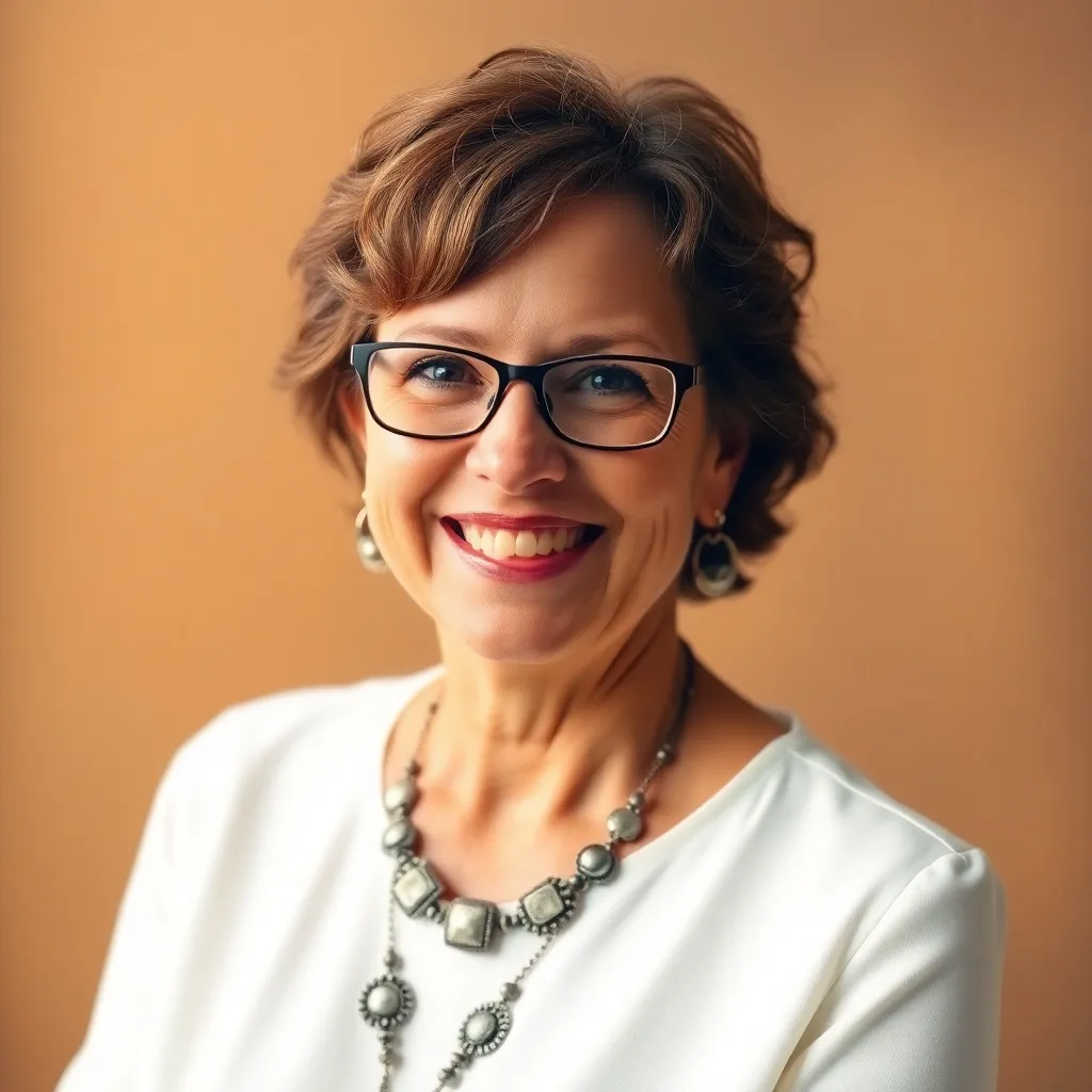 Create a professional teacher headshot. The subject is a smiling, middle-aged woman with short, curly brown hair and glasses. She's wearing a crisp white blouse and a statement necklace. The background is a warm, neutral tone with a slight blur. The lighting is soft and natural, with a hint of warmth.