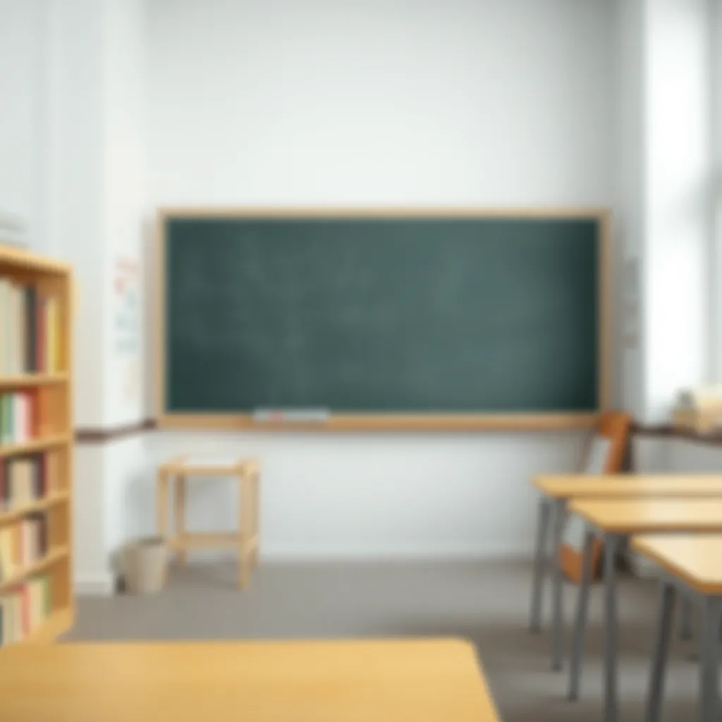 Create a professional teacher headshot featuring a warm and approachable educator with a kind smile. The teacher is wearing a crisp white blouse and a simple yet elegant necklace. The background is a soft, blurred image of a classroom with chalkboards and books. The overall tone is calm and inviting.