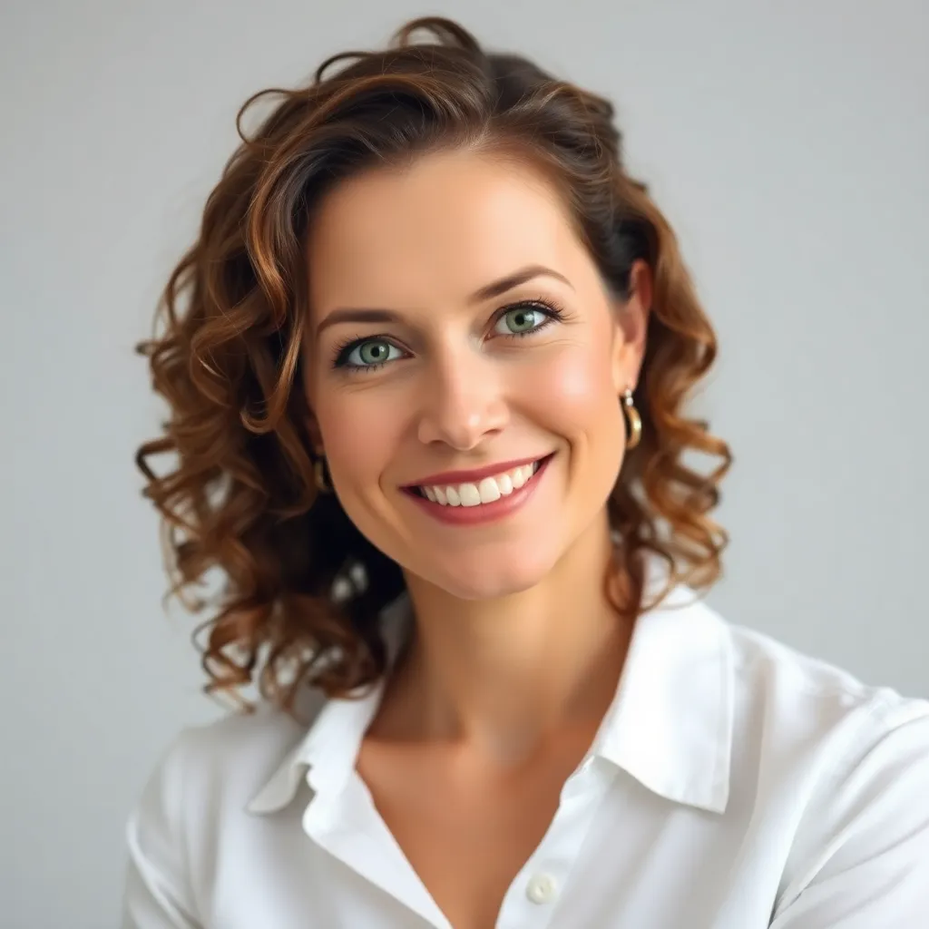 Create a professional headshot of a teacher with a warm and approachable smile. She has short, curly brown hair and bright green eyes. She's wearing a crisp white blouse and a pair of dark trousers. The background is a subtle texture of a school hallway. The overall mood is friendly and approachable.