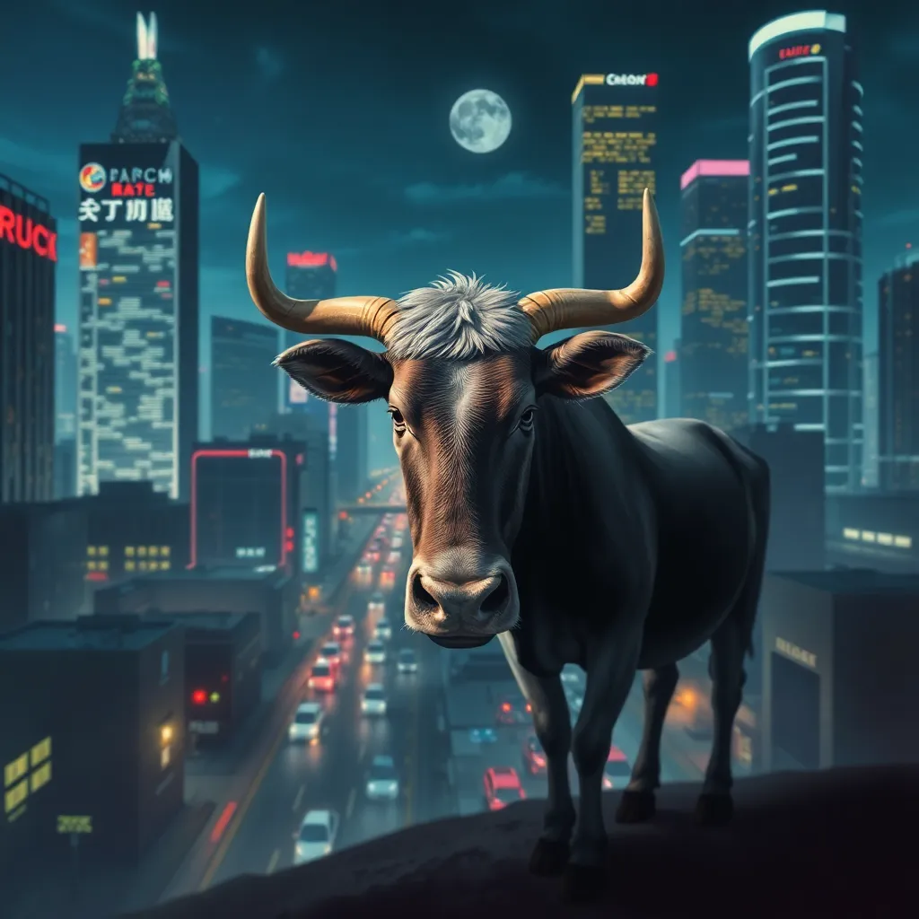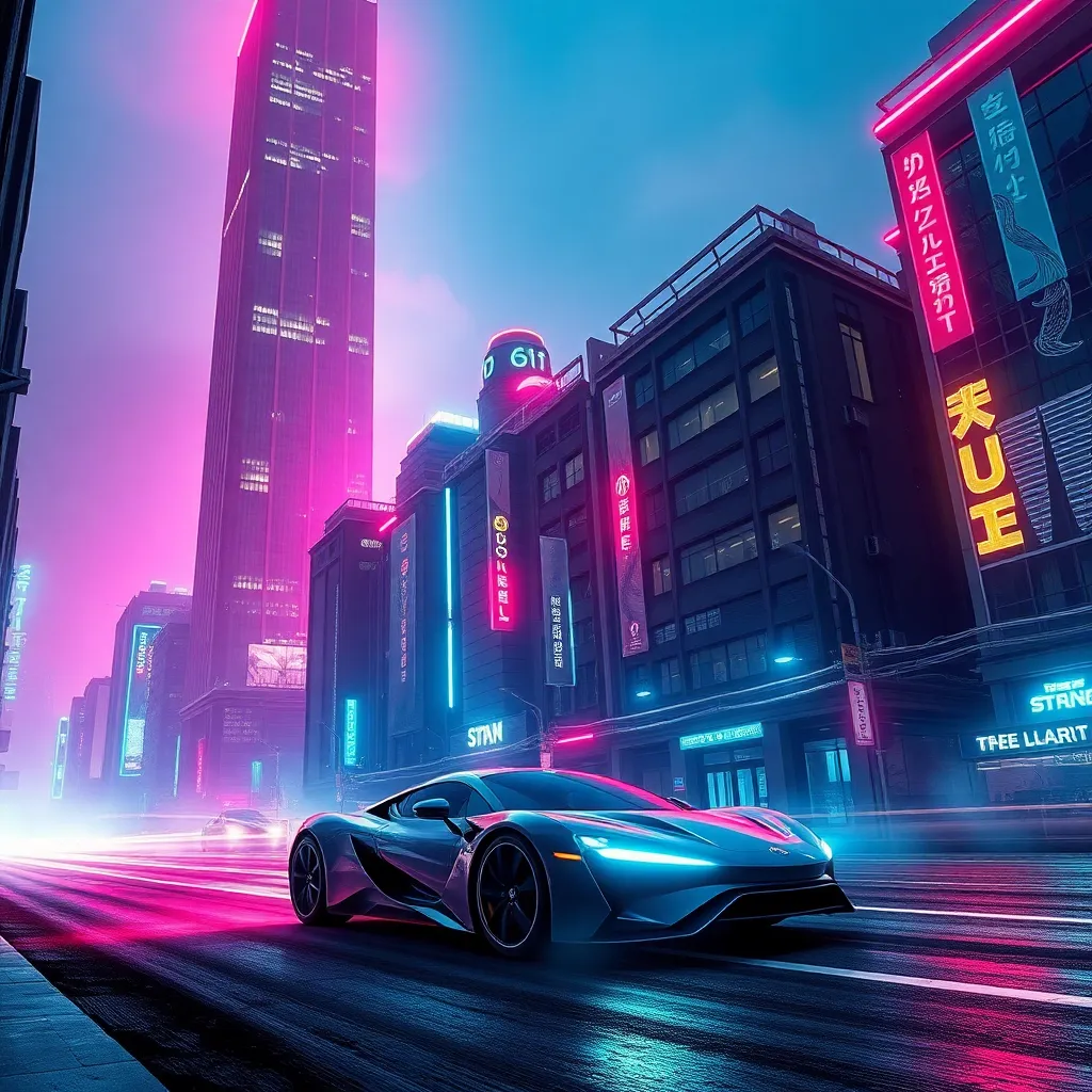 Create a futuristic cityscape with a sleek skyscraper, neon-lit streets, and a flying car hovering above. Incorporate subtle AI-generated details, such as glowing circuitry and wispy code patterns. Use a vibrant color palette with bold contrasts, evoking a sense of innovation and progress. Generate a high-resolution image (1920x1080) for a cutting-edge marketing campaign.