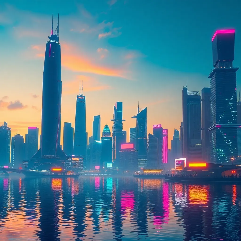 Create a mesmerizing AI-generated image of a futuristic cityscape at sunset, with towering skyscrapers and neon lights reflecting off the water. Incorporate subtle AI-generated human figures in the distance, going about their daily lives, blending seamlessly with the futuristic architecture. Use vibrant colors and high-contrast lighting to bring the scene to life.