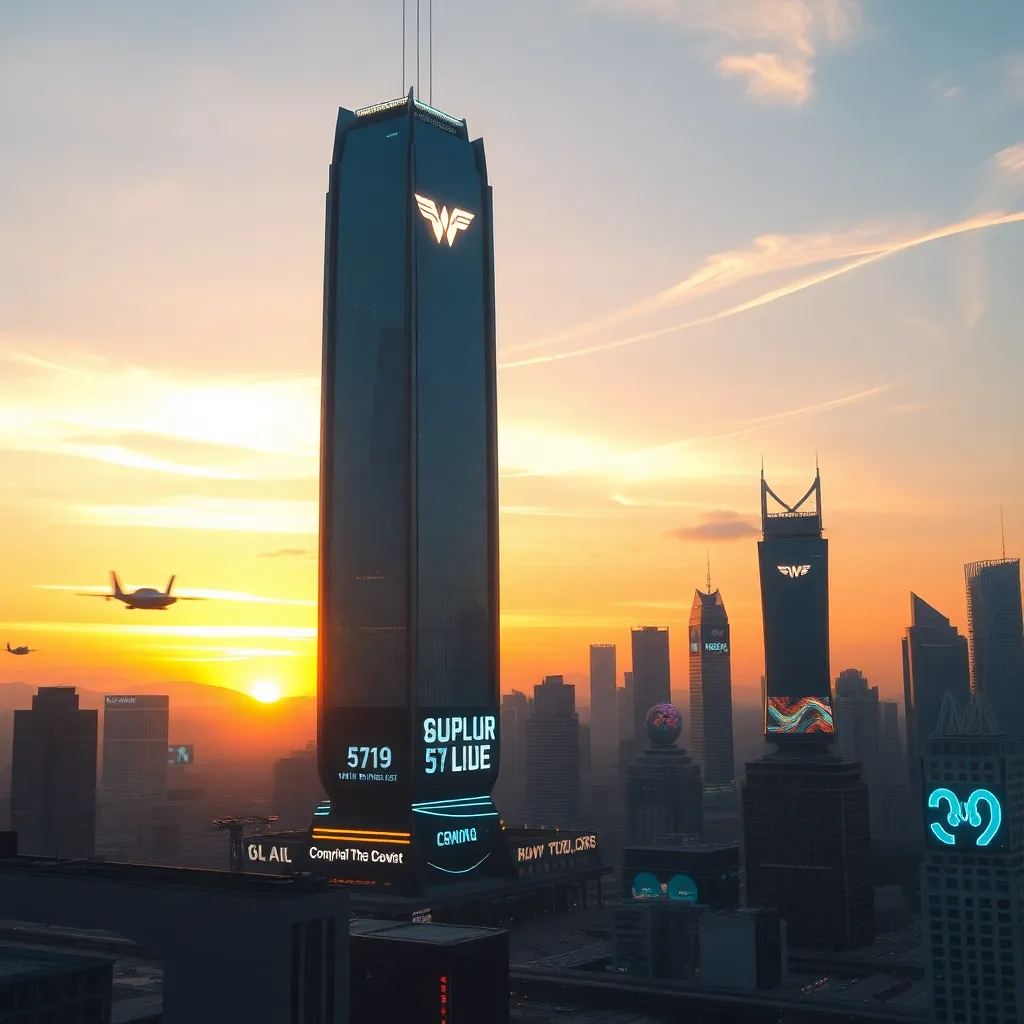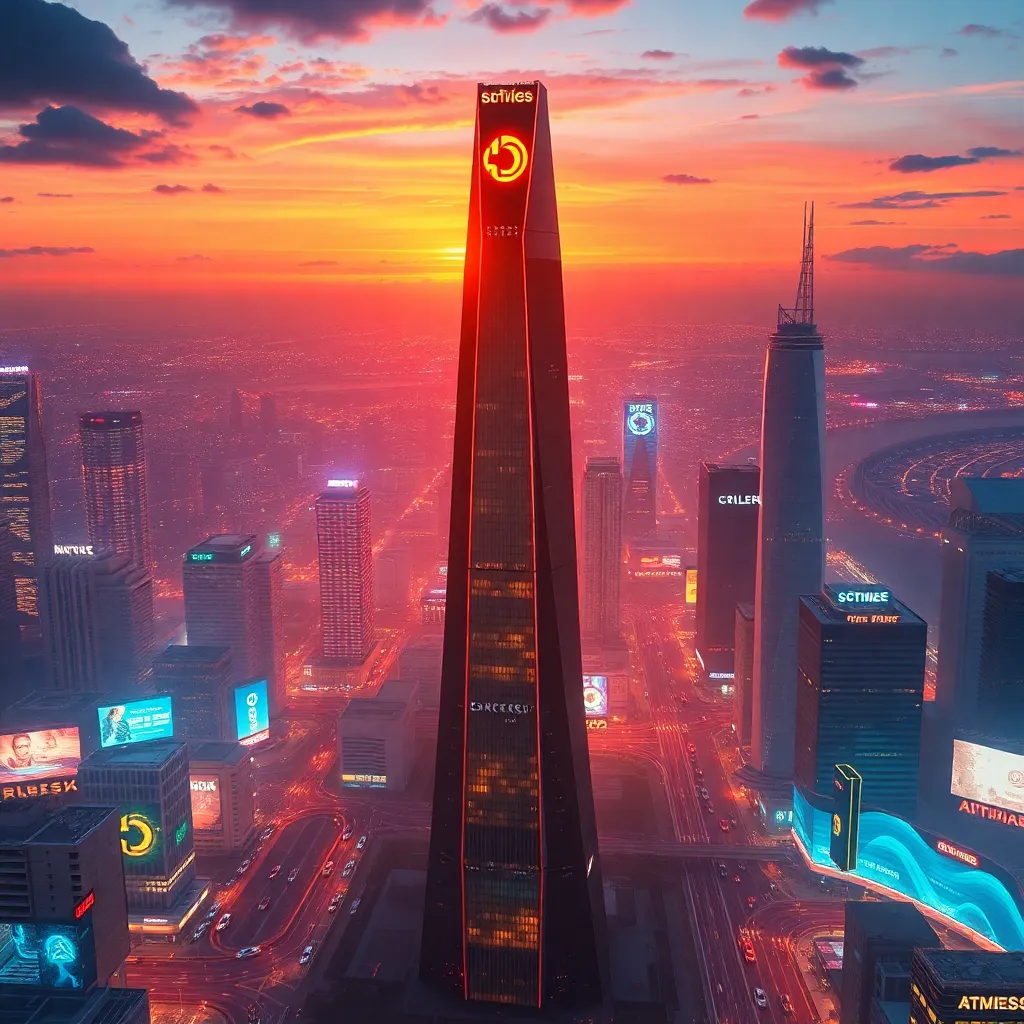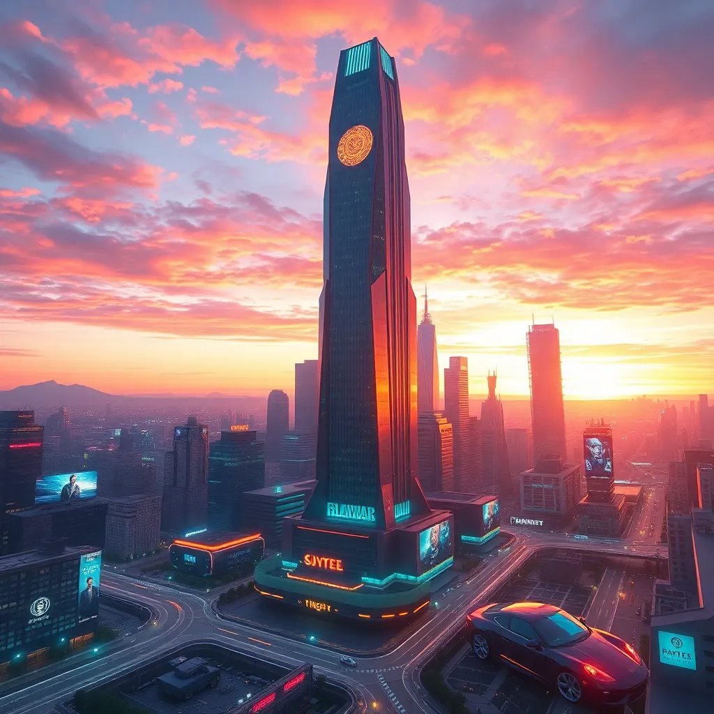 Create a futuristic cityscape at sunset, featuring a towering skyscraper with a glowing neon logo, surrounded by sleek flying cars and holographic advertisements. Incorporate subtle AI-generated details, such as glowing circuitry on the building's exterior and wispy cloud formations that seem to shift and change shape