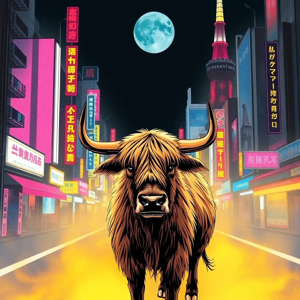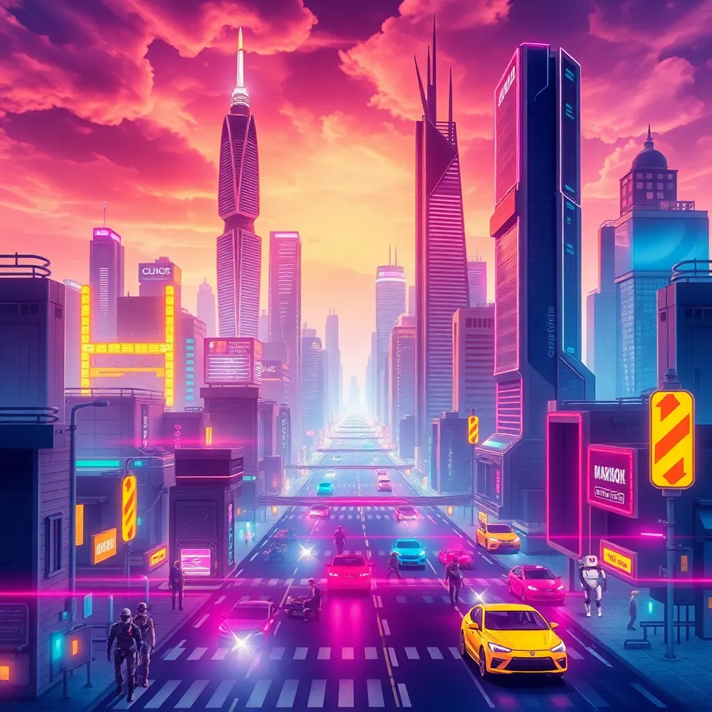 Create a stunning AI-generated image for a futuristic cityscape. Imagine a metropolis with sleek skyscrapers, glowing neon lights, and a vibrant atmosphere. Incorporate AI-generated characters, robots, and vehicles to bring this futuristic world to life. Use vibrant colors and bold lines to capture the energy and excitement of this city.