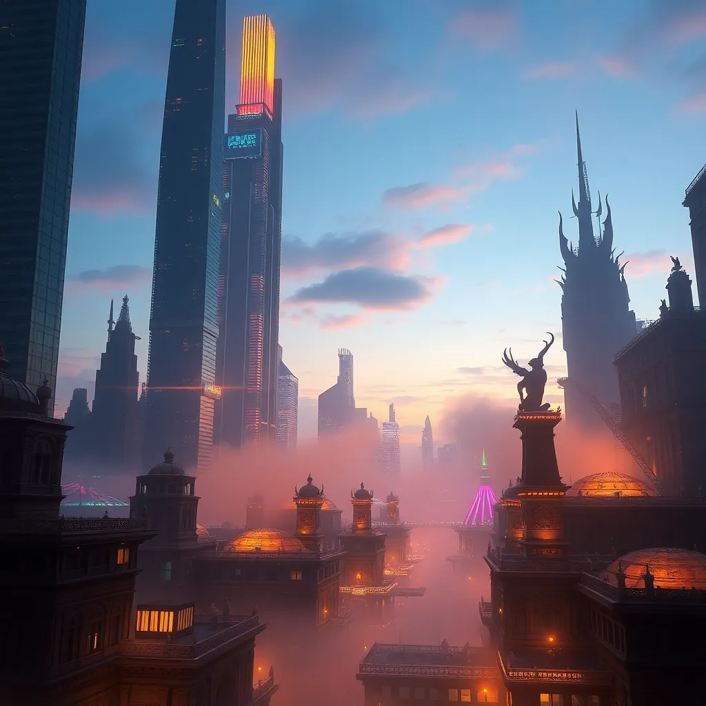 Create a stunning AI-generated image of a futuristic cityscape at dusk, with towering skyscrapers, glowing neon lights, and a hint of misty fog. Incorporate subtle nods to ancient architecture and mythical creatures, blending the old with the new. The image should evoke a sense of wonder and curiosity.