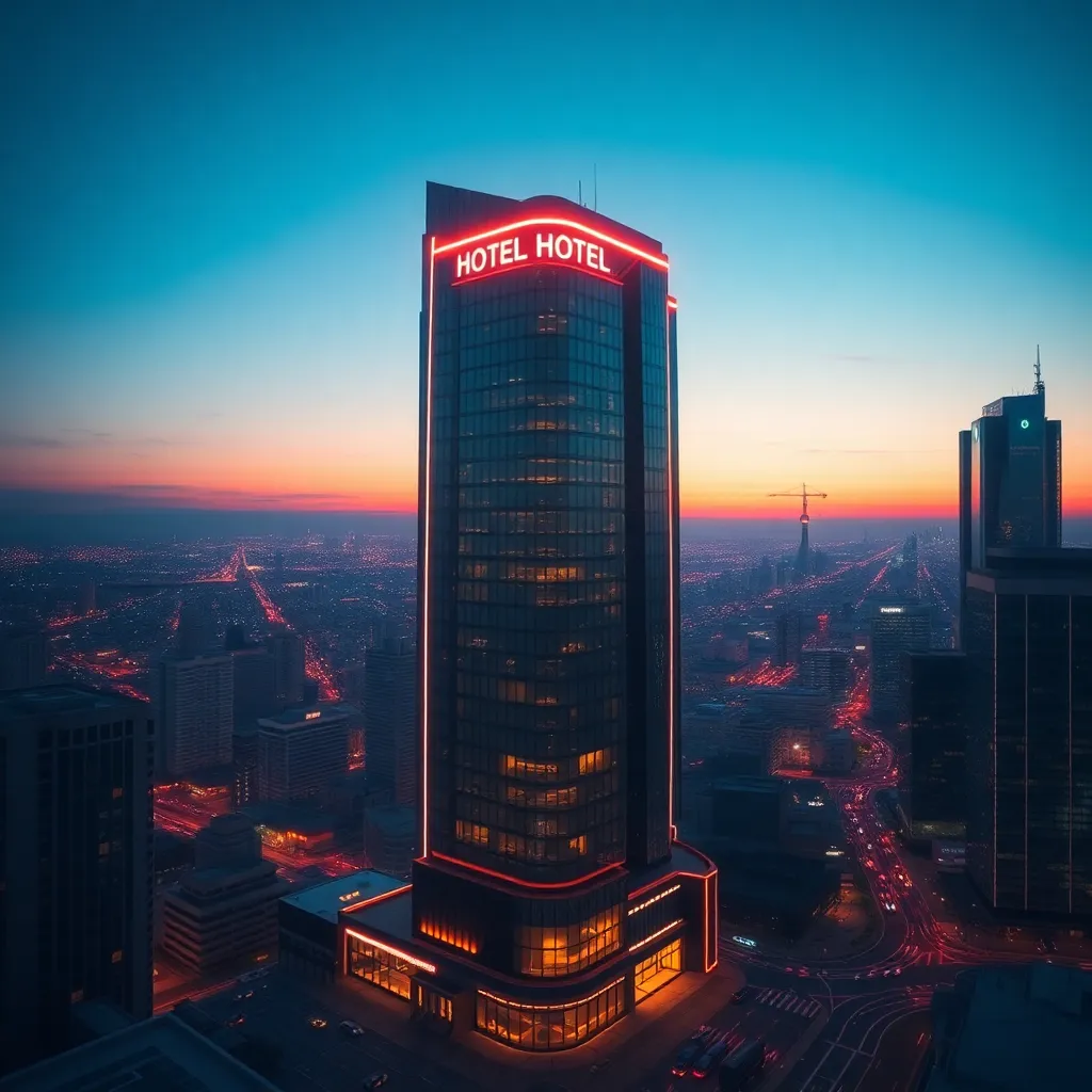 Create a captivating AI-generated image for a futuristic luxury hotel's marketing campaign. The image should feature a sleek, high-rise building with a glowing neon sign, surrounded by a vibrant cityscape at dusk. Incorporate subtle AI-generated patterns and textures to give the image a unique, otherworldly feel.
