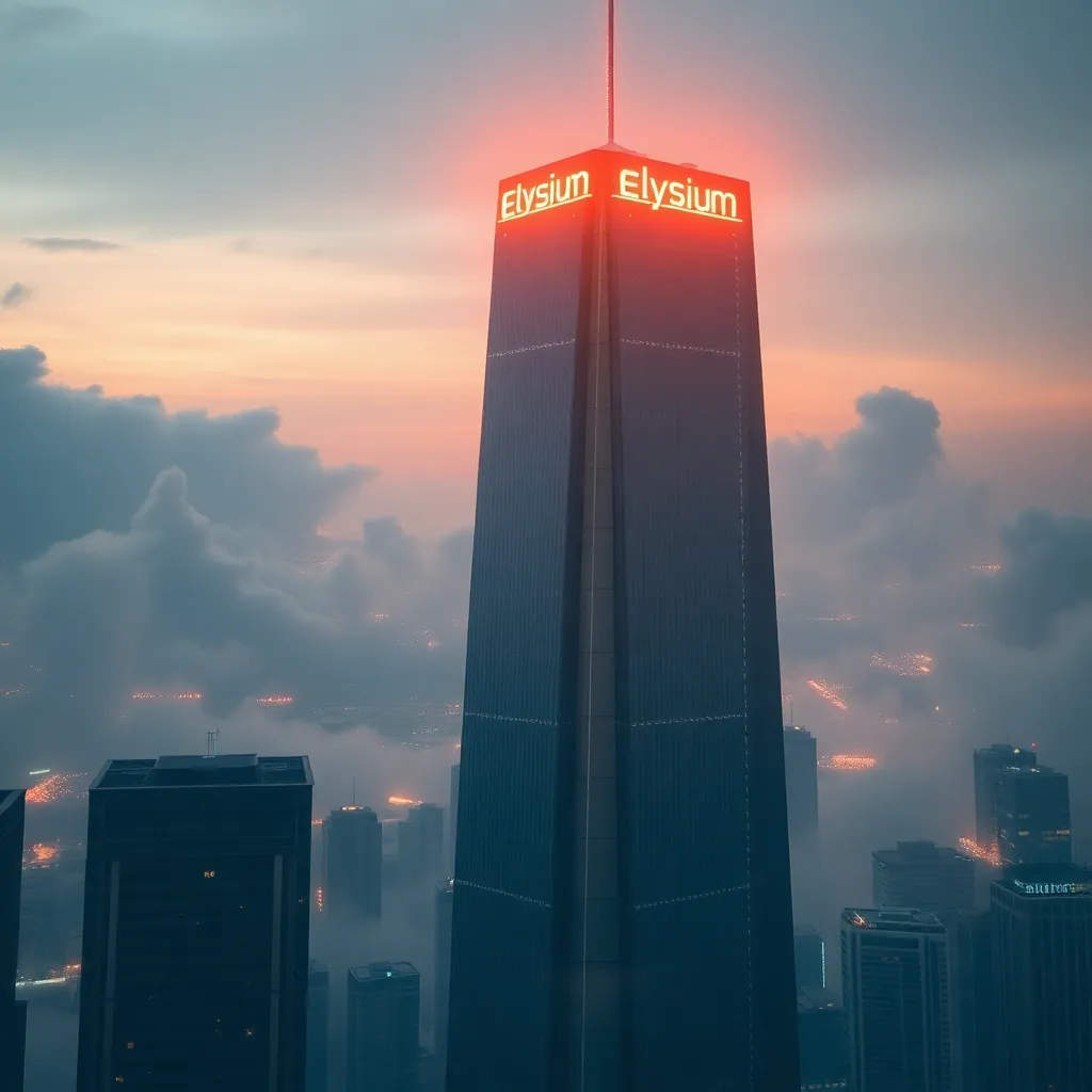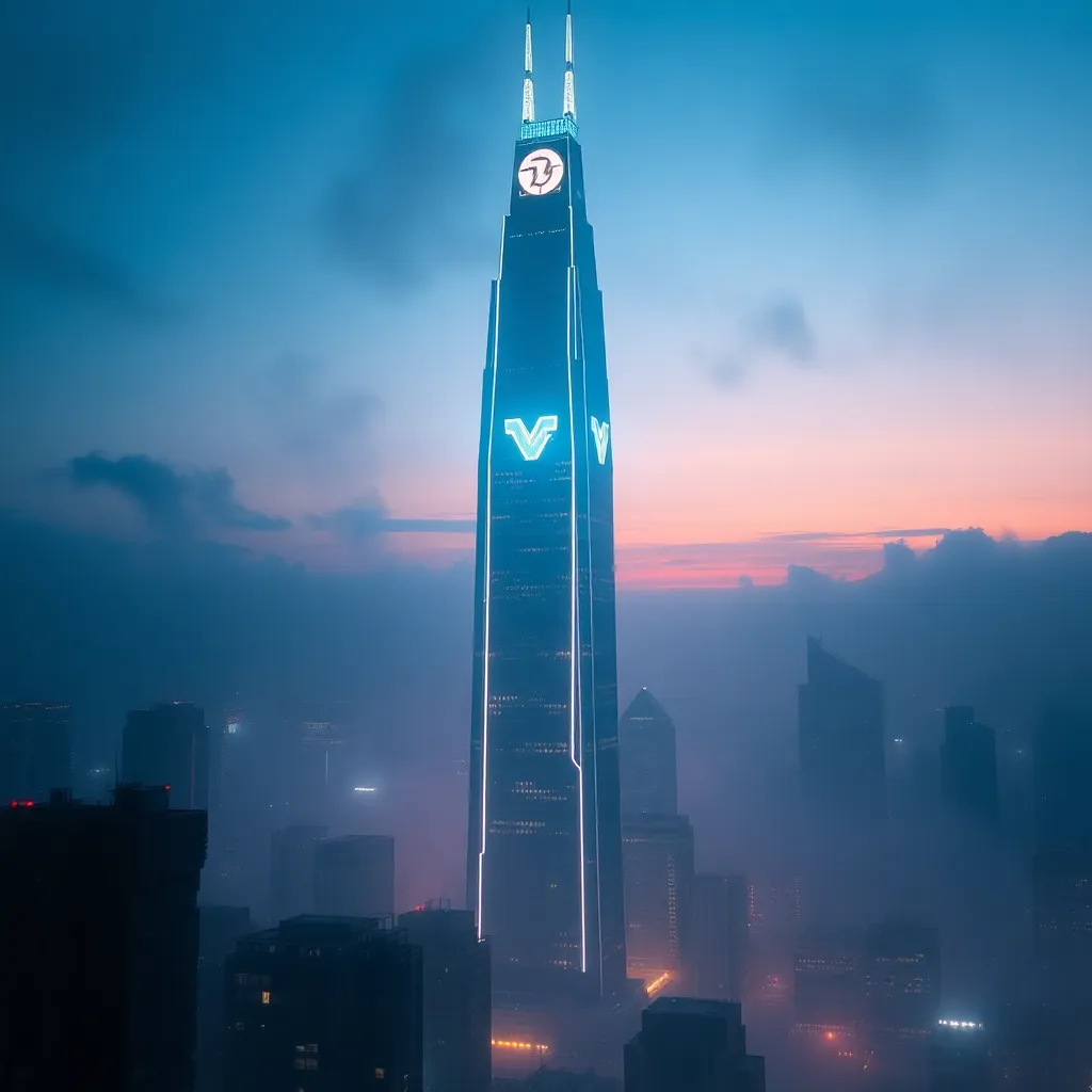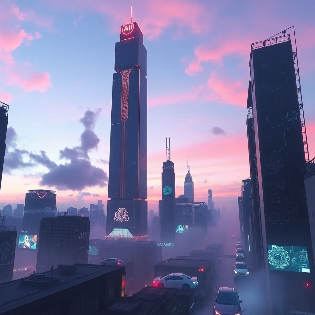 Create a surreal, futuristic cityscape at dusk, featuring a towering skyscraper with a glowing AI core, surrounded by levitating cars and holographic advertisements. Incorporate subtle hints of neon-lit circuitry and a wispy, ethereal fog. Use bold colors and striking contrasts to capture the essence of innovation and technological advancement.