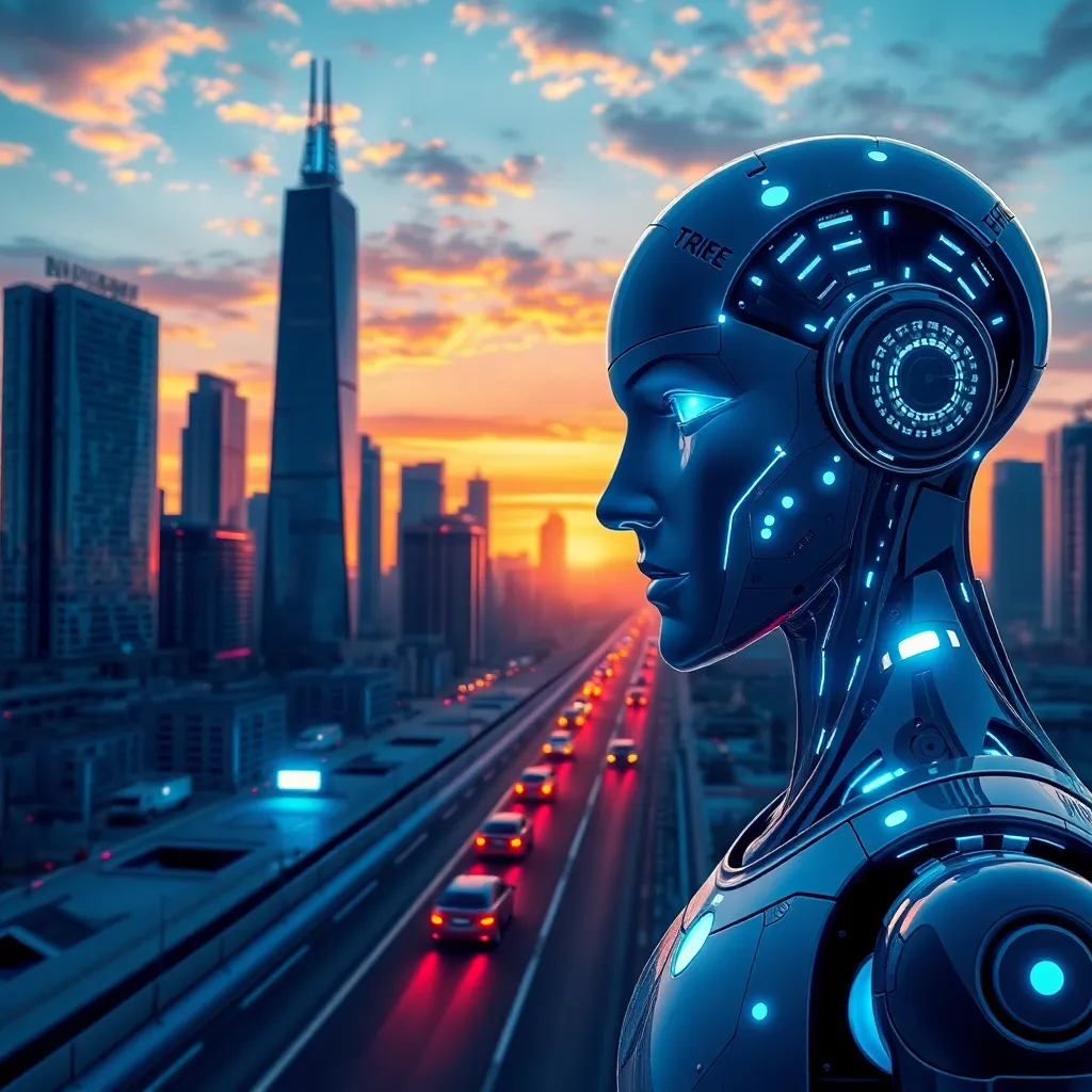 Create a futuristic cityscape at sunset, with towering skyscrapers and flying cars zipping by. Incorporate a prominent AI model as the main attraction, perhaps a humanoid robot with glowing blue circuits and a serene expression. Use vibrant colors and dynamic lighting to capture the essence of innovation and progress.