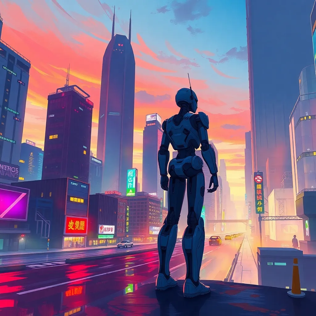Create a futuristic cityscape at dusk, with towering skyscrapers and neon lights reflecting off the wet pavement. Incorporate a humanoid robot standing atop a skyscraper, gazing out at the city with a sense of wonder. Use a vibrant color palette and bold brushstrokes to capture the energy and excitement of the scene.