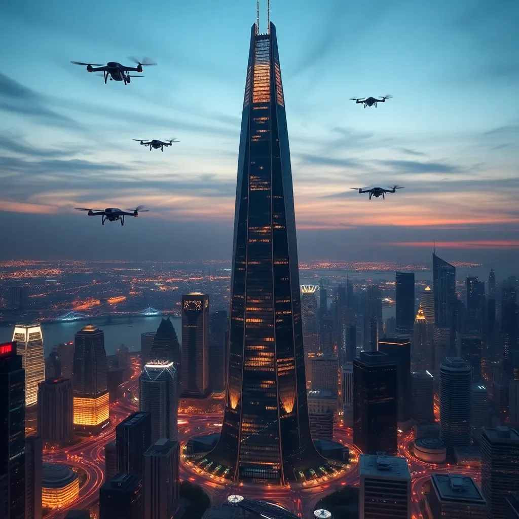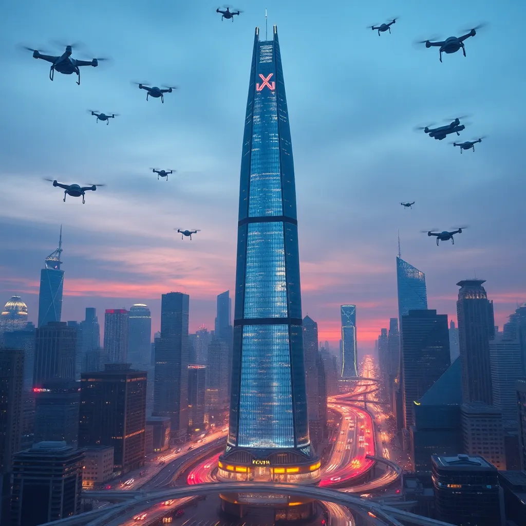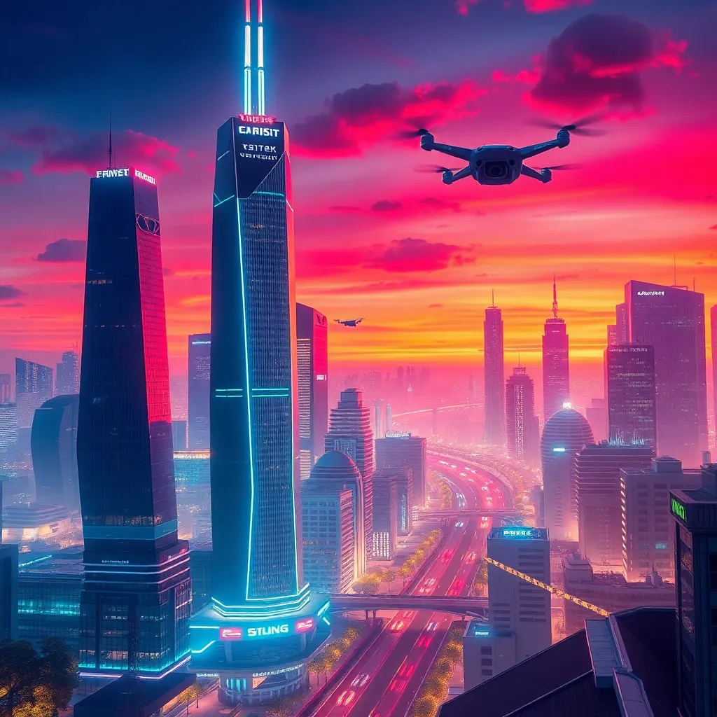 Create a captivating AI-generated portrait of a futuristic cityscape, featuring a sleek skyscraper with a glowing neon logo, surrounded by hovering drones and a vibrant atmosphere. Incorporate subtle AI-generated patterns and textures to give the image a sense of depth and dimensionality. Make it a stunning work of art!