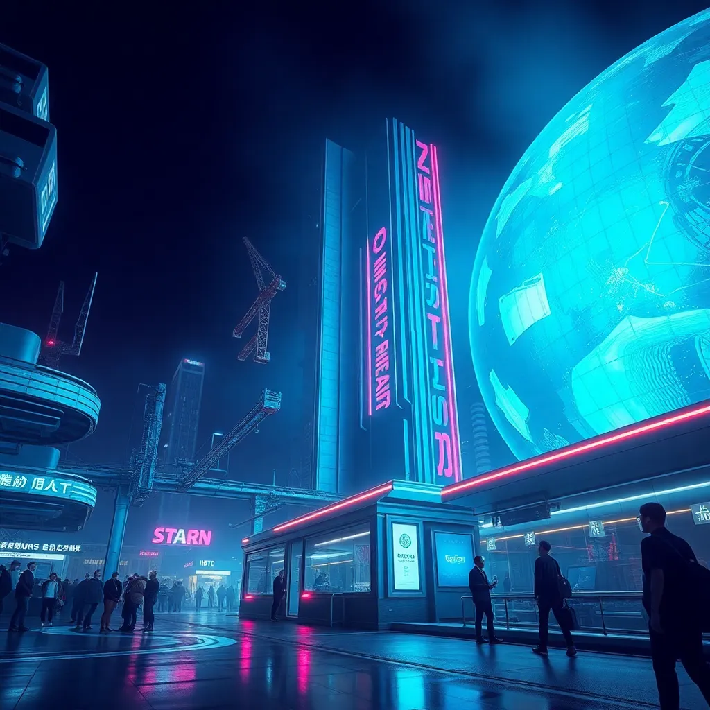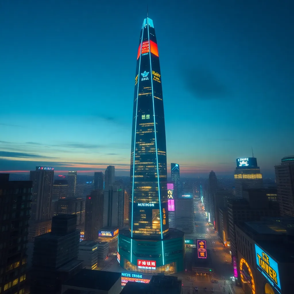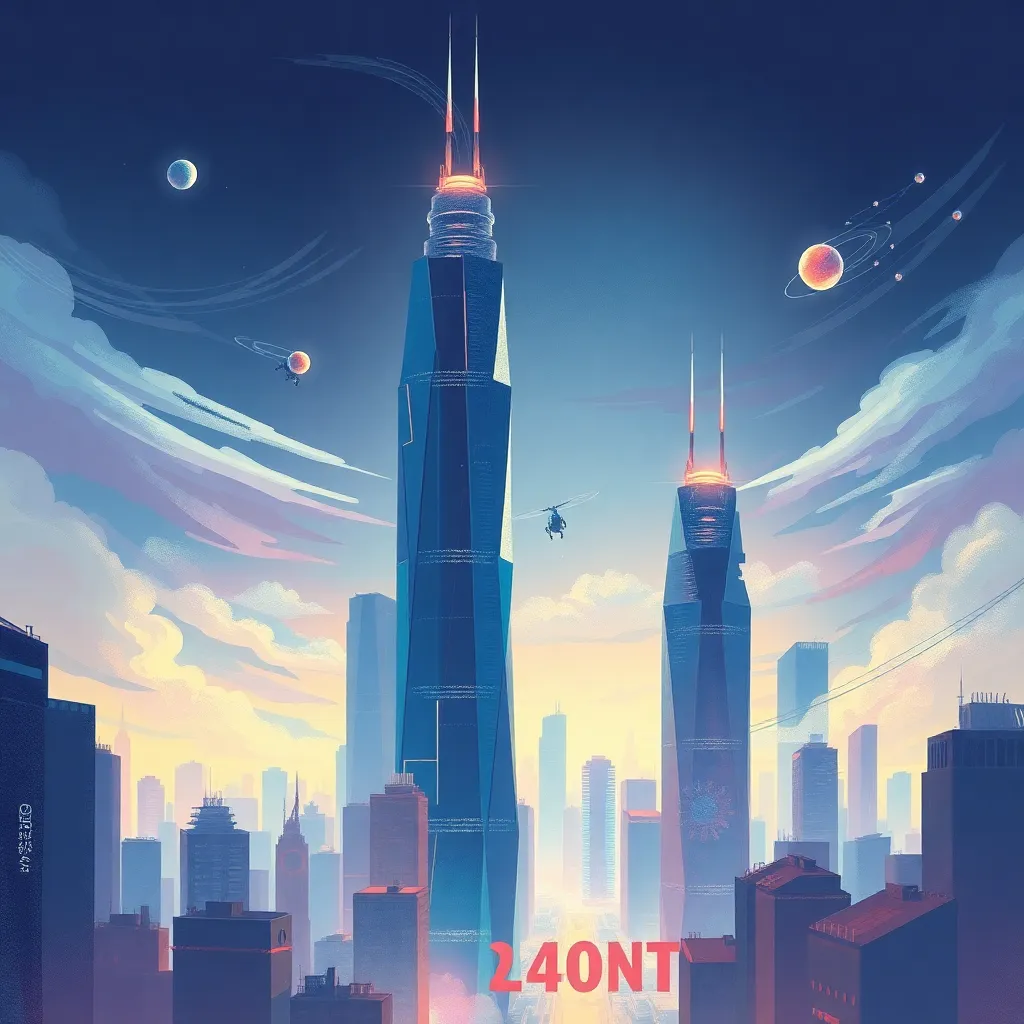 Create a captivating AI-generated portrait of a futuristic cityscape, featuring a sleek skyscraper with a glowing neon logo, surrounded by hovering drones and a vibrant atmosphere. Incorporate subtle AI-generated patterns and textures to give the image a sense of depth and dimensionality. Make it a stunning work of art!