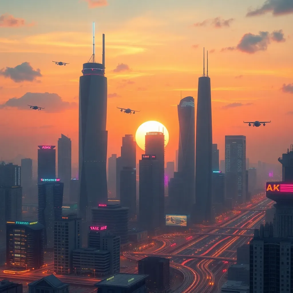 Create a stunning AI-generated image of a futuristic cityscape at sunset, with towering skyscrapers, flying cars, and a vibrant atmosphere. Incorporate subtle neon lights and a hint of smoke from hoverbikes. Use a mix of abstract shapes and realistic textures to create a visually striking and immersive scene.