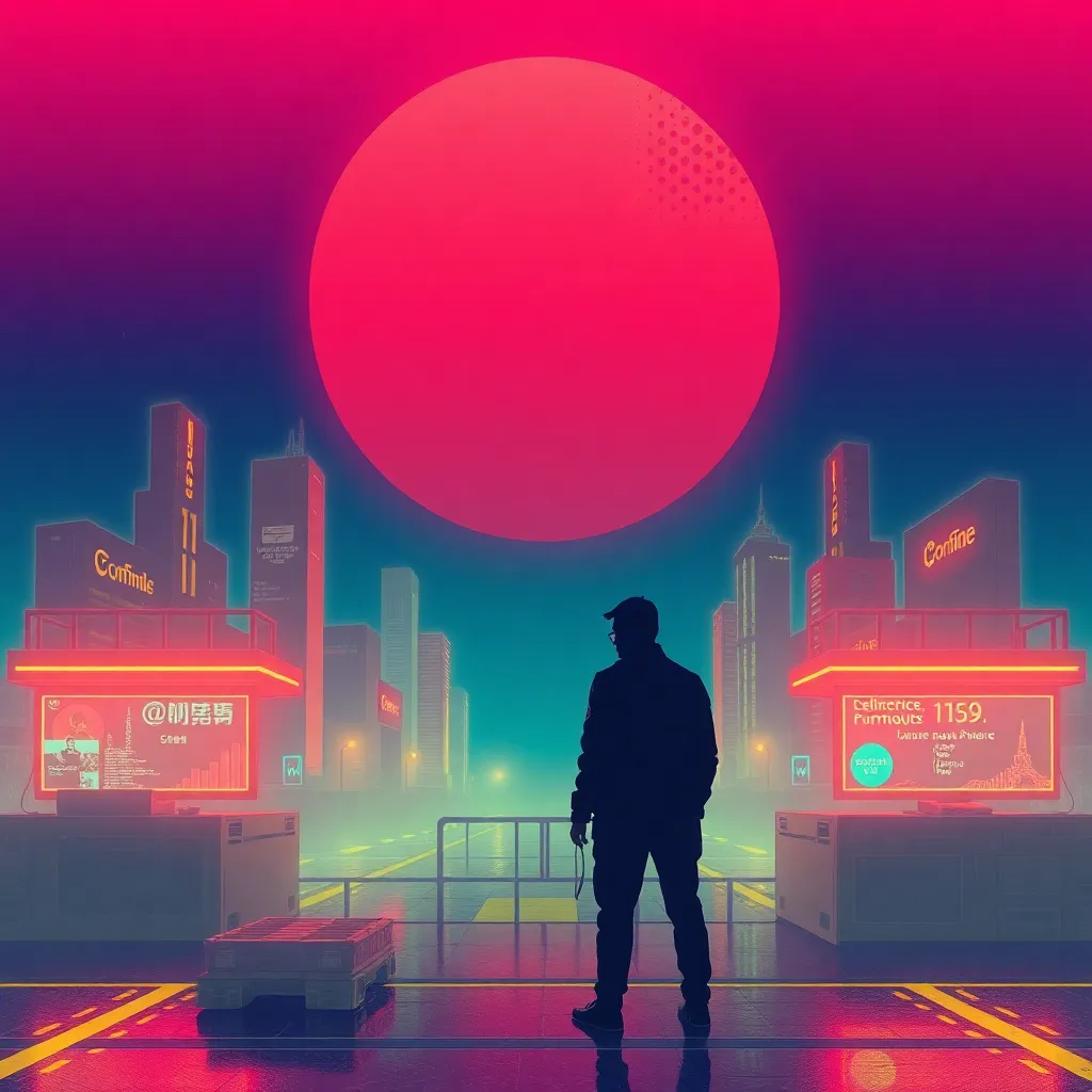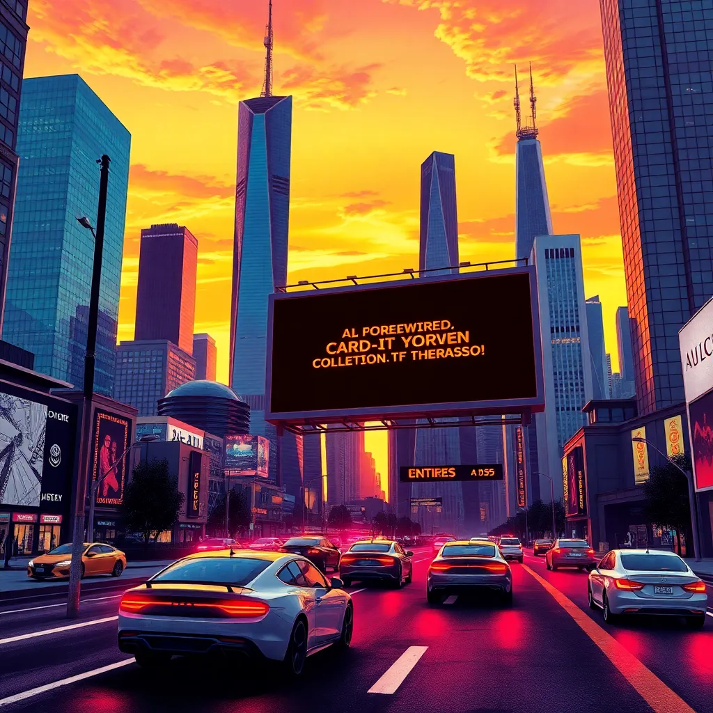 Create a futuristic cityscape at sunset, with sleek skyscrapers and flying cars zipping by. Incorporate a prominent AI-powered billboard displaying a cryptic message. Use vibrant colors and bold lines to capture the essence of innovation and progress. The city should be bustling with activity, yet have a hint of eeriness.