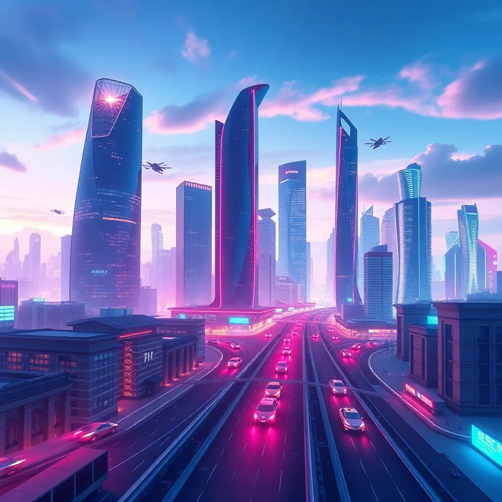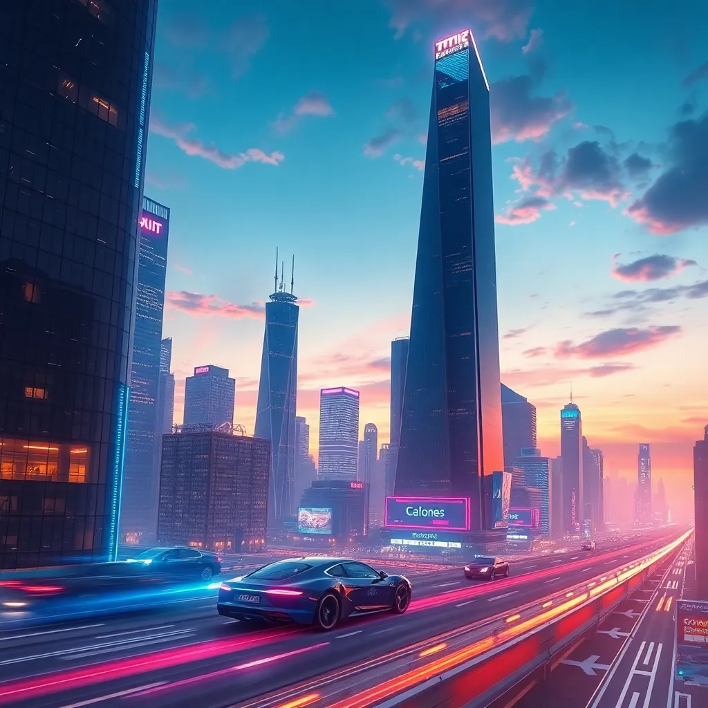 Create a stunning AI-generated image of a futuristic cityscape at sunset, with sleek skyscrapers, flying cars, and a vibrant atmosphere. Incorporate subtle hints of artificial intelligence and technology, such as glowing blue lines and neon lights. The image should exude a sense of innovation and wonder.