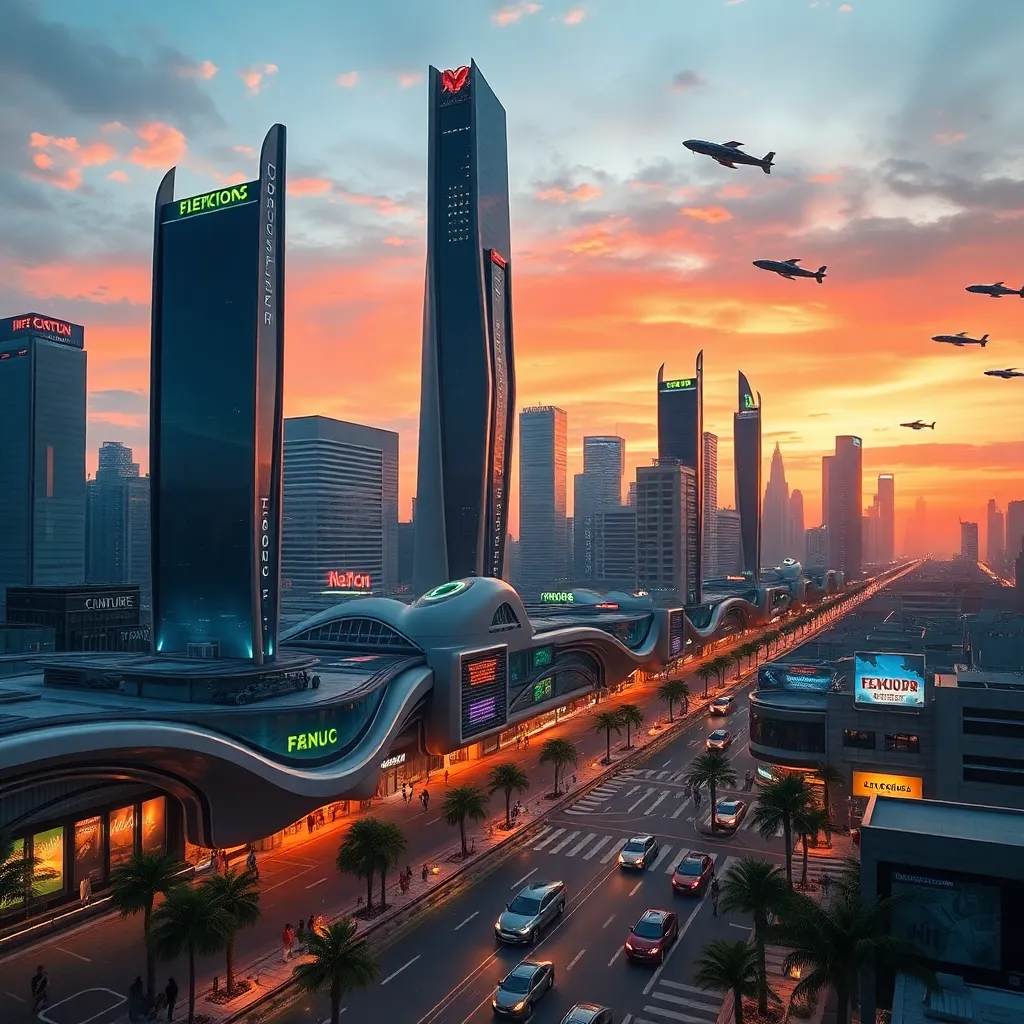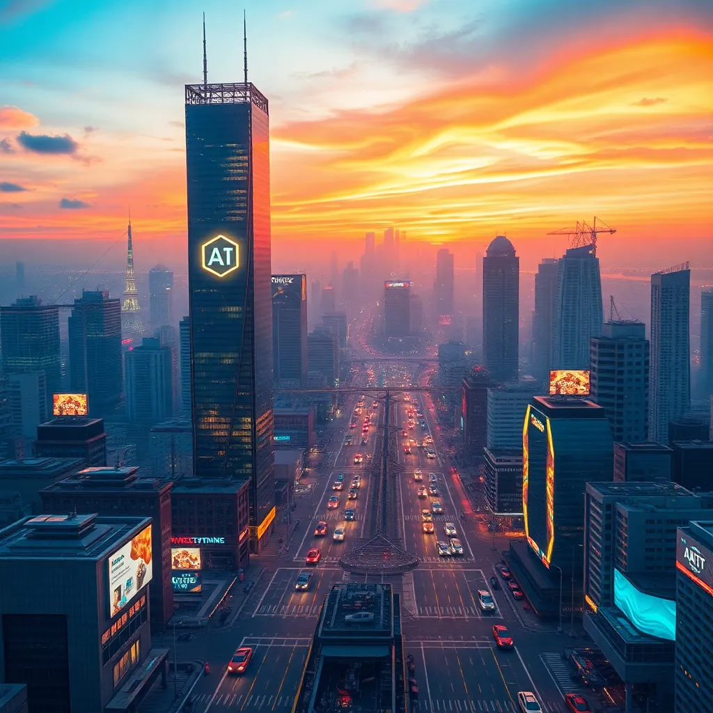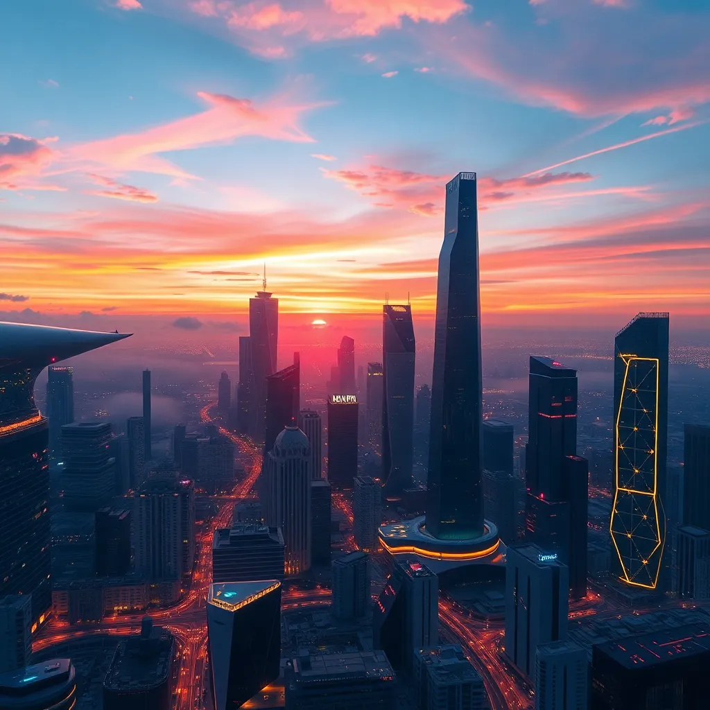 Create a captivating AI-generated image of a futuristic cityscape at sunset, featuring a sleek skyscraper with a glowing AI-powered logo, surrounded by a vibrant cityscape with flying cars and neon-lit billboards. Incorporate subtle AI-inspired patterns and textures to create a sense of innovation and technological advancement.