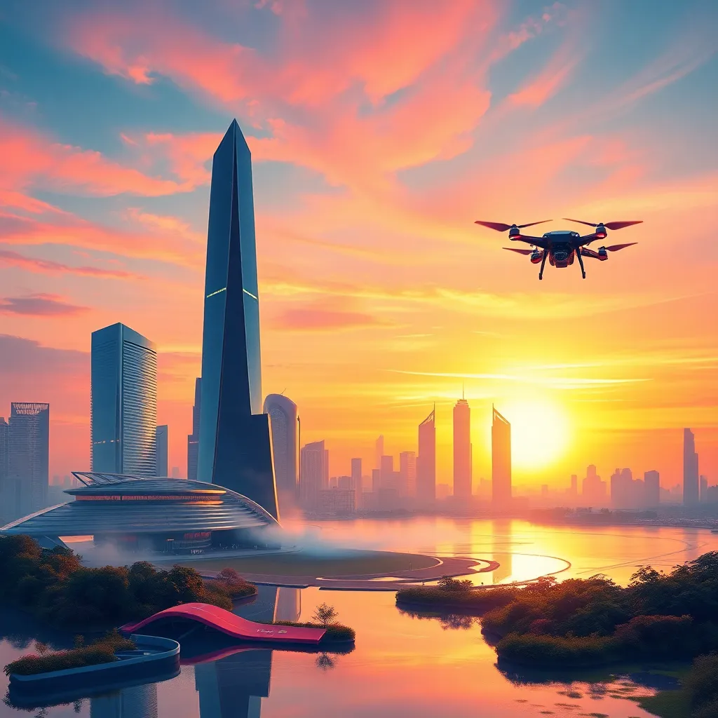 Create a stunning futuristic cityscape at sunset, with sleek skyscrapers, hovering drones, and a serene lake in the foreground. Incorporate subtle neon lights and a hint of mist. Use vibrant colors and bold brushstrokes to capture the essence of innovation and progress. Output a high-resolution image, 4K minimum.