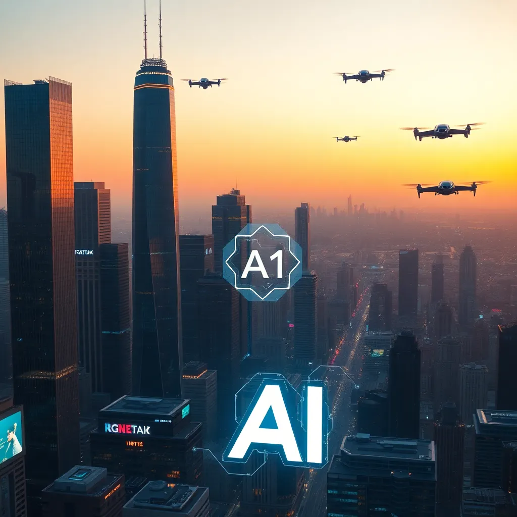 Create a futuristic cityscape at dusk, with towering skyscrapers and a sprawling metropolis. Incorporate a prominent AI logo in the foreground, surrounded by holographic advertisements and flying drones. The sky should be a warm orange hue, with a subtle glow from the city's neon lights. Make it captivating and futuristic!