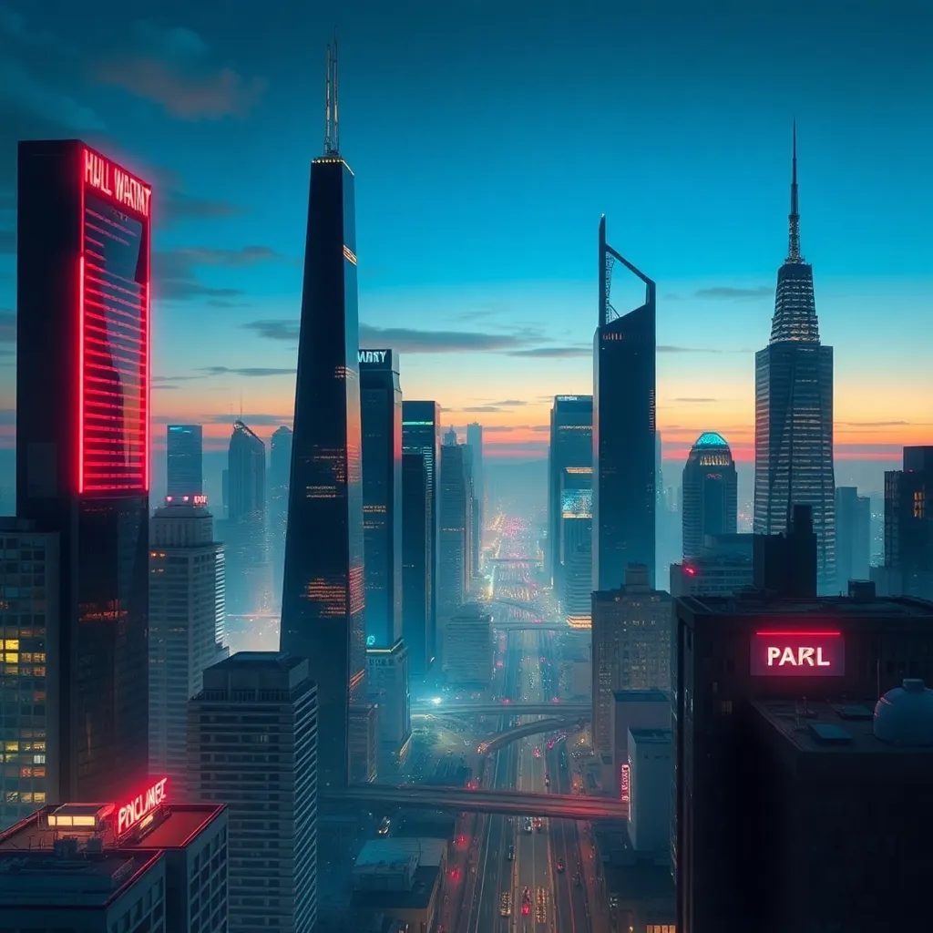 Create a surreal, futuristic cityscape at dusk, with towering skyscrapers made of iridescent glass and neon-lit streets that pulse with an otherworldly energy. Incorporate AI-generated humanoid figures in various poses, blending seamlessly into the urban landscape. Use vibrant colors and bold brushstrokes to bring this dystopian dreamscape to life.