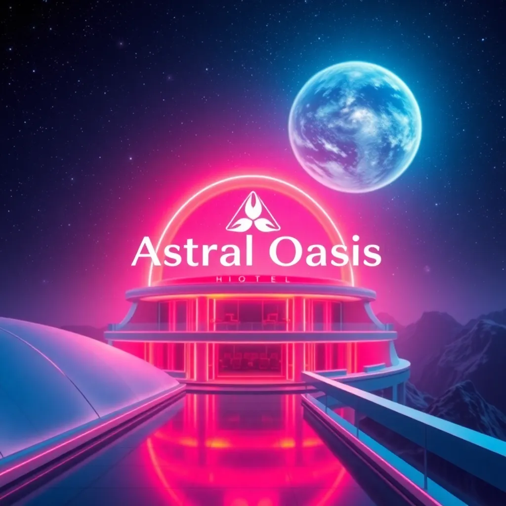 Create a captivating AI-generated image for a futuristic luxury space hotel. Incorporate sleek lines, neon lights, and a majestic starry night sky. The hotel's logo, 'Astral Oasis,' should be prominently displayed. Use vibrant colors and textures to convey a sense of opulence and adventure. Output a 4K resolution image.