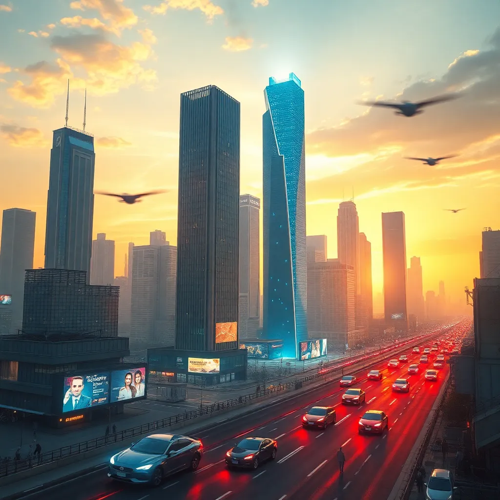 Create an AI-generated image of a futuristic cityscape at sunset, featuring towering skyscrapers, sleek flying cars, and a vibrant atmosphere. Incorporate subtle neon lights and holographic advertisements, blending seamlessly into the urban landscape. Style should evoke a sense of optimism and innovation, showcasing the beauty of human-AI collaboration.