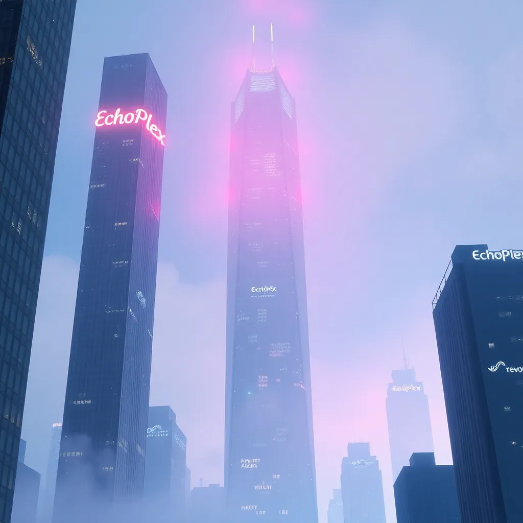 Create a captivating AI-generated image for a futuristic cityscape, featuring a towering skyscraper with a glowing neon sign reading 'EchoPlex' in bold, cursive script. Incorporate a subtle AI-generated mist effect, with soft, ethereal lighting and a hint of blue-purple hue to evoke a sense of otherworldliness.