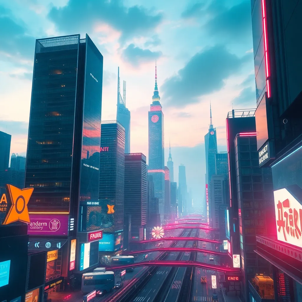 Create a stunning AI-generated image for a futuristic cityscape. Imagine a metropolis with towering skyscrapers, holographic advertisements, and flying vehicles zipping by. Incorporate vibrant colors and dynamic lighting to capture the essence of a bustling urban environment. Make it a breathtaking masterpiece that transports viewers to a world of tomorrow.