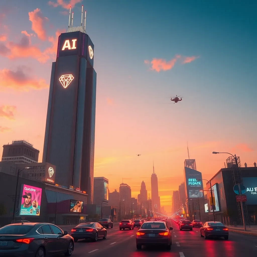 Create a futuristic cityscape at sunset, featuring a towering skyscraper with a glowing AI logo, surrounded by flying cars and holographic advertisements. Incorporate a subtle sense of nostalgia by including vintage-style streetlights and a retro-futuristic aesthetic. Use vibrant colors and bold textures to bring this innovative world to life.