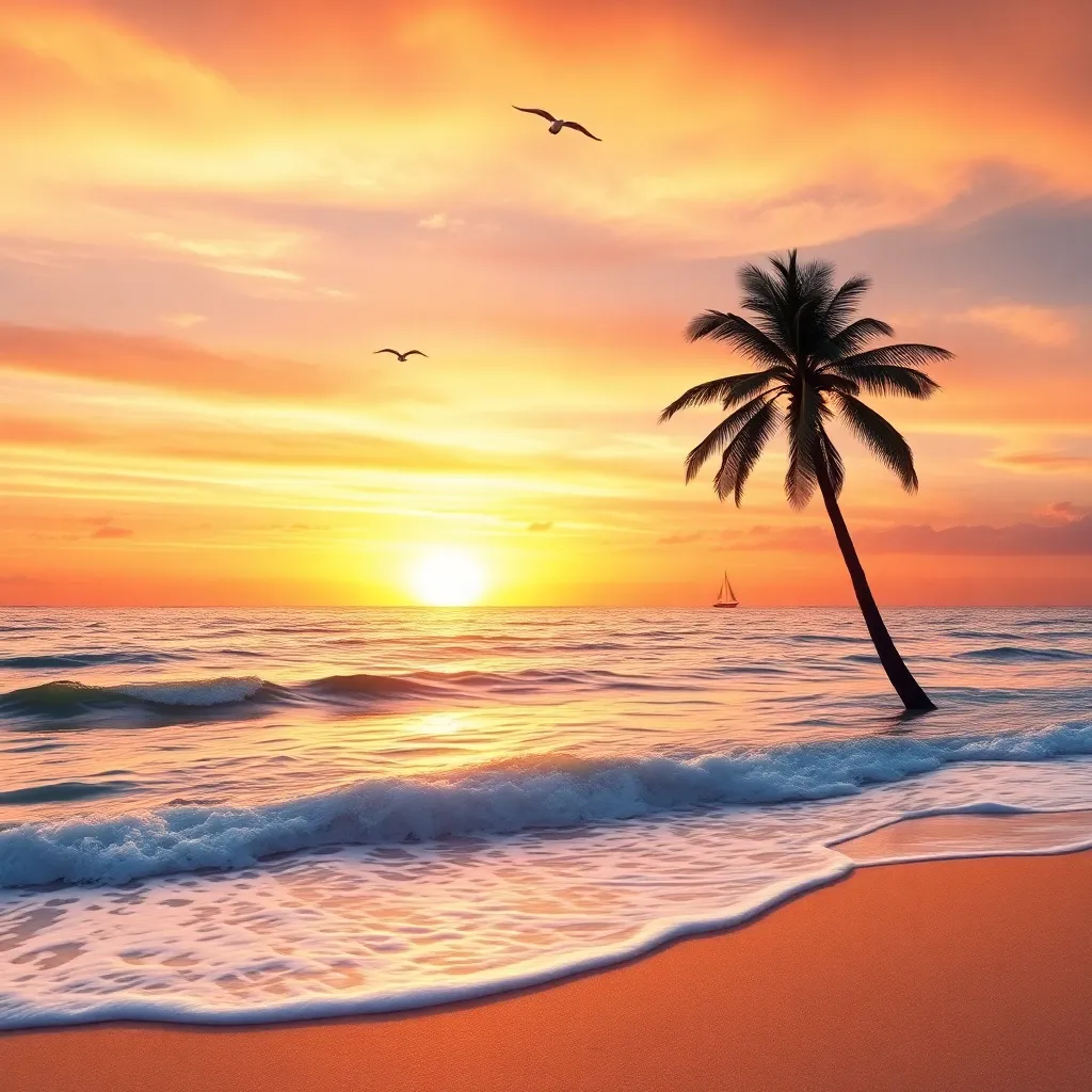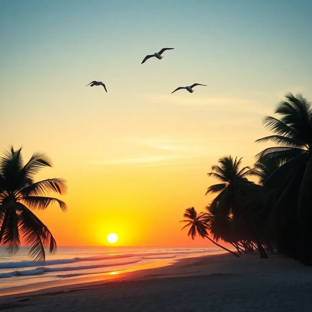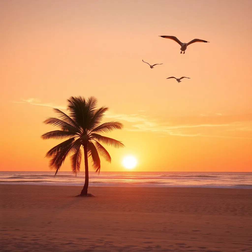 Create a stunning beach scene at sunset. A serene coastline with palm trees swaying in the gentle breeze. A warm orange glow illuminates the sky as the sun dips into the ocean. A few seagulls fly overhead, their silhouettes adding depth to the serene atmosphere. Generate an image with a sense of tranquility.