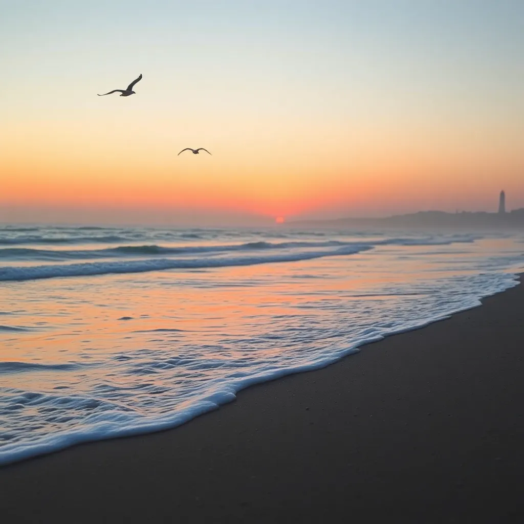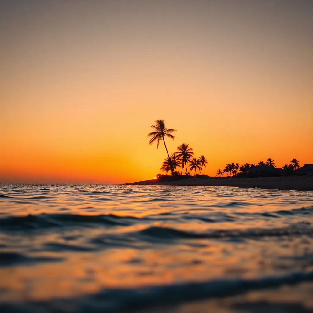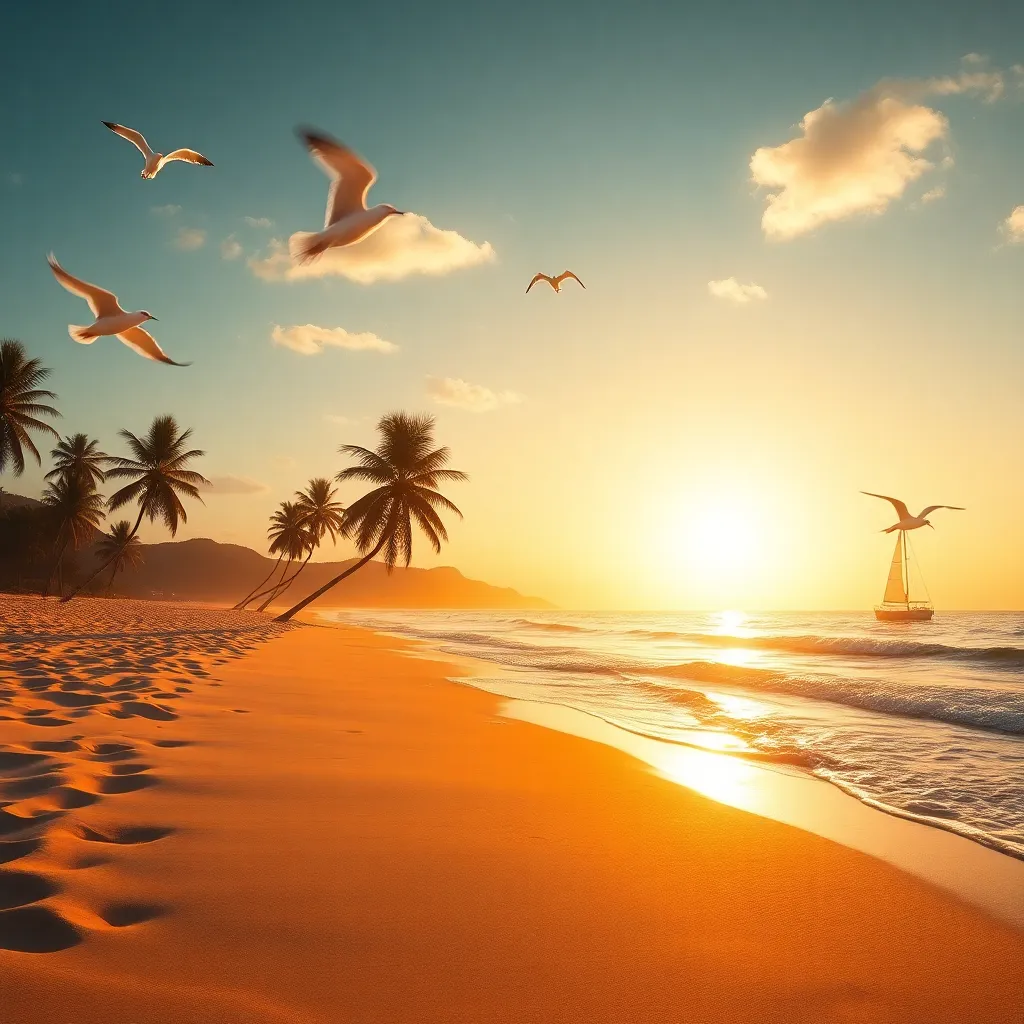 Create a stunning beach scene at sunset. A serene coastline with palm trees swaying in the gentle breeze. A warm orange glow illuminates the sky as the sun dips into the ocean. A few seagulls fly overhead, their silhouettes adding depth to the serene atmosphere. Generate an image with a sense of tranquility.