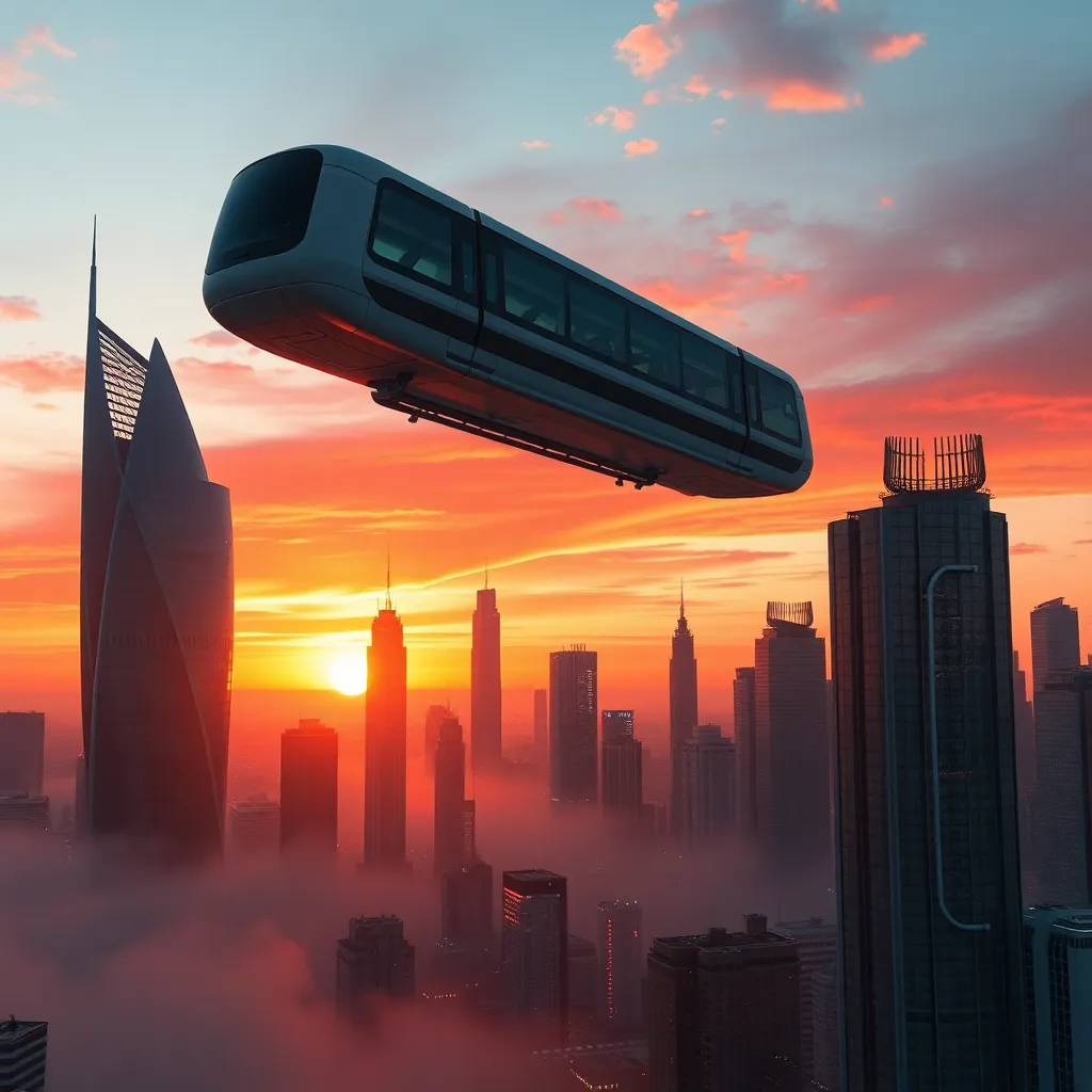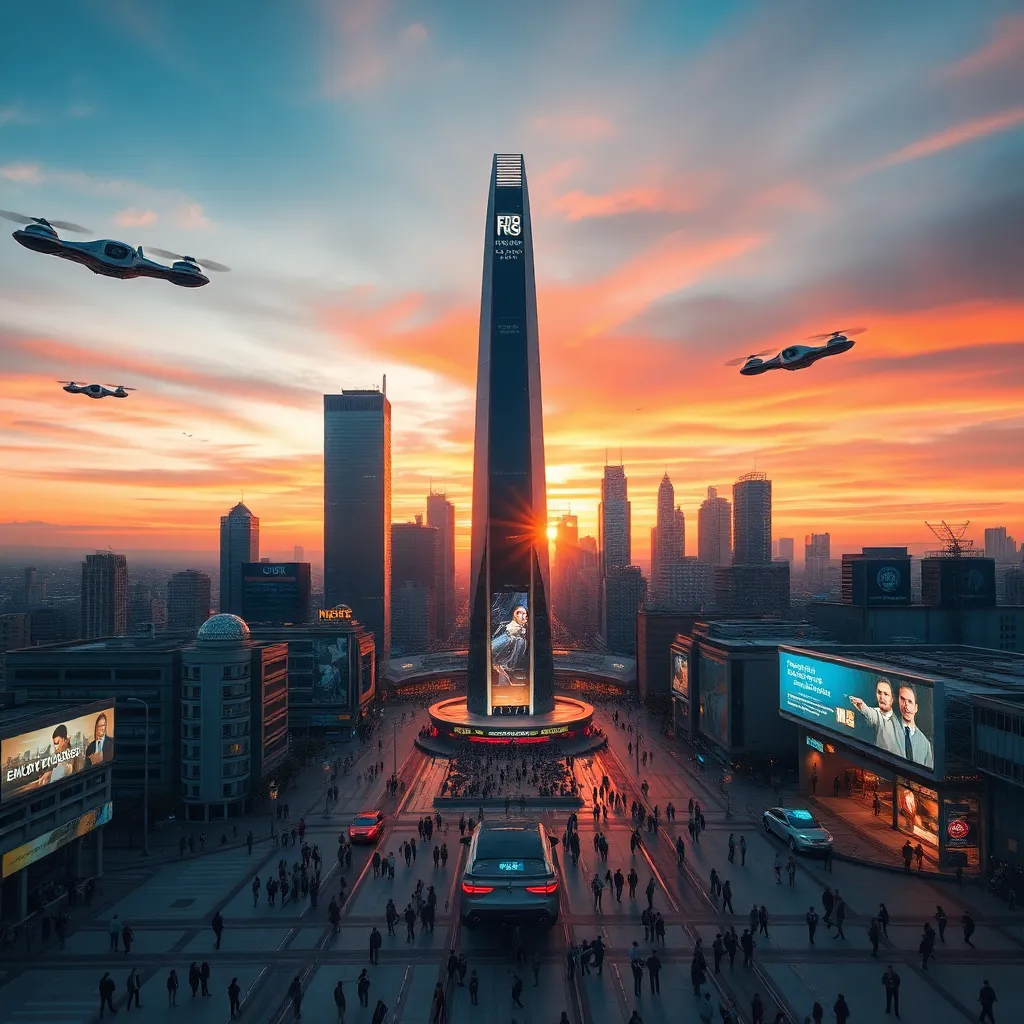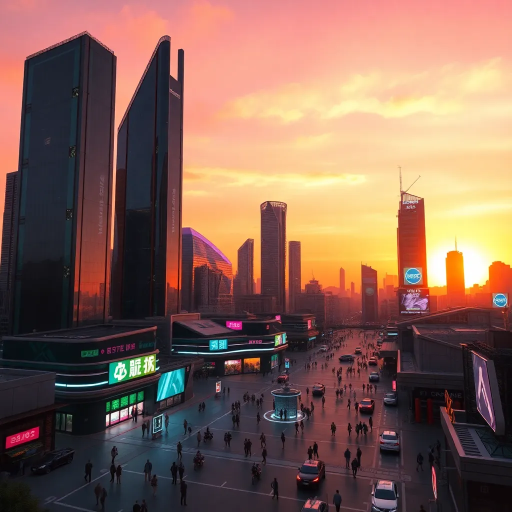 Create an image of a futuristic cityscape at sunset, with sleek skyscrapers and a vibrant city square. The sky is a warm orange hue with pinkish undertones. The city is bustling with people, cars, and hoverbikes. Incorporate neon lights and holographic advertisements to give the image a futuristic feel.