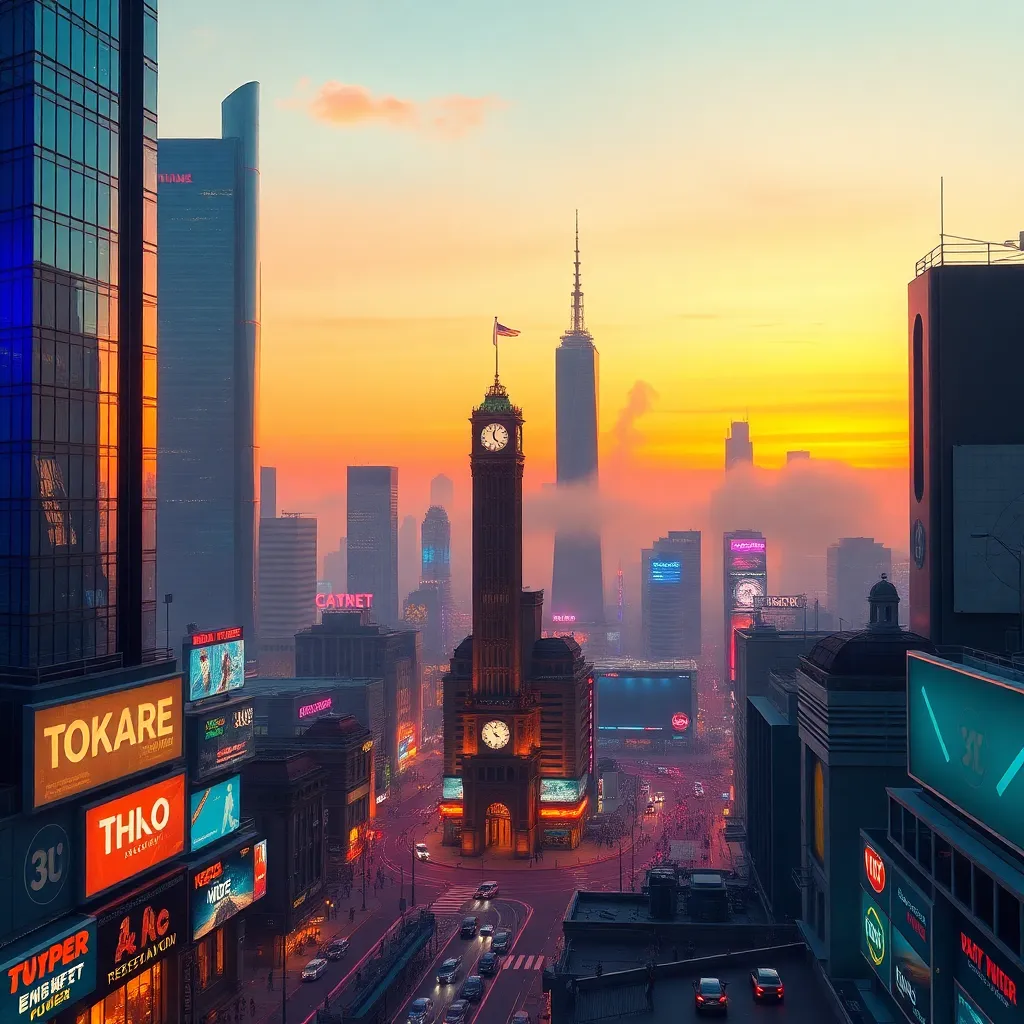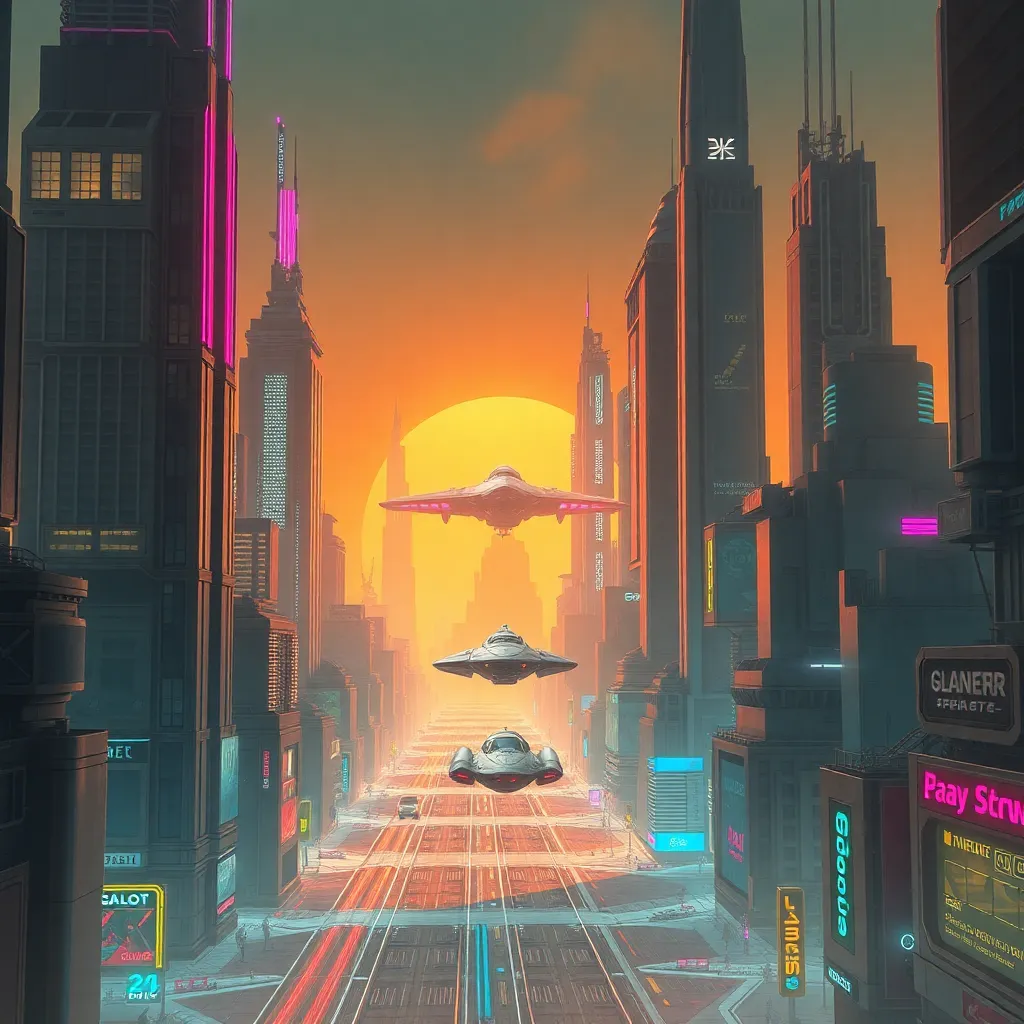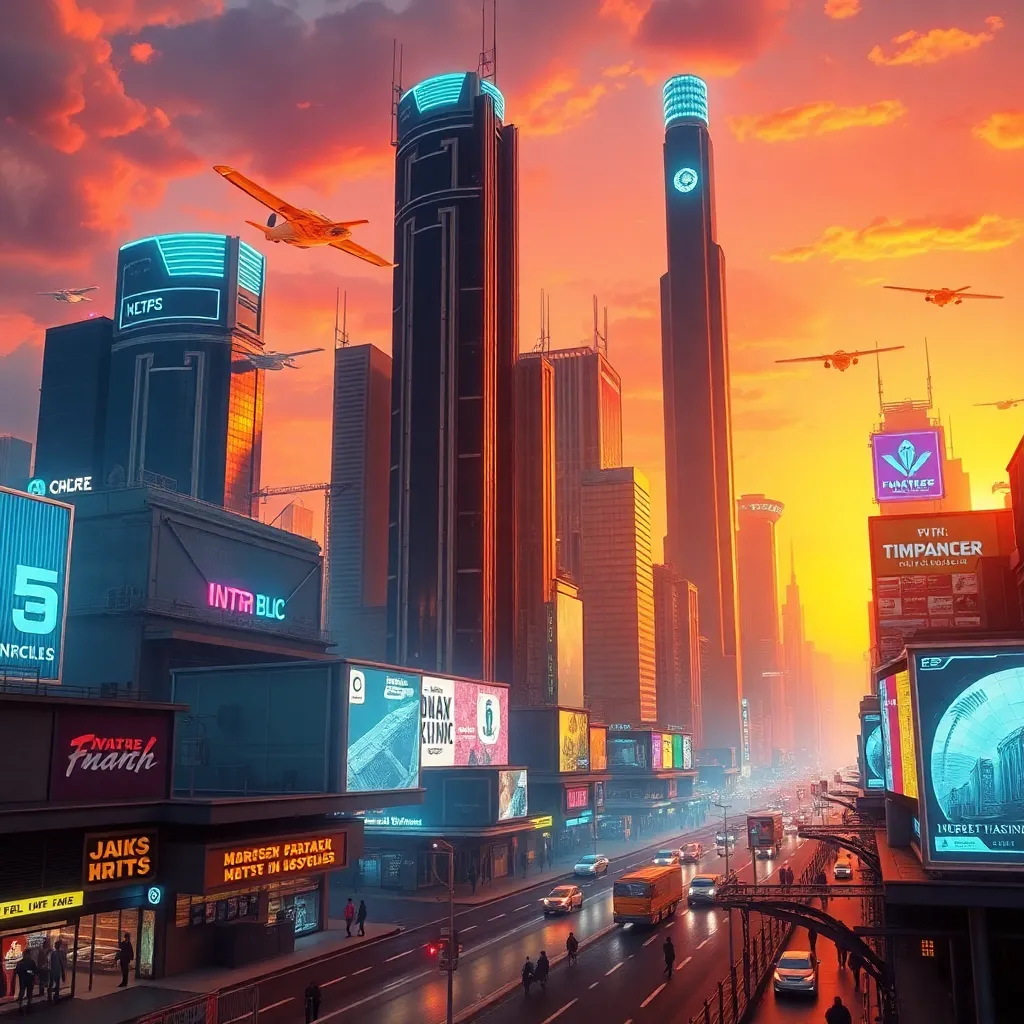 Create a futuristic cityscape at sunset, with towering skyscrapers, flying cars, and a vibrant atmosphere. Incorporate neon lights, holographic advertisements, and a bustling street scene. Use a warm color palette and blend realistic elements with sci-fi elements to create a unique and captivating image.