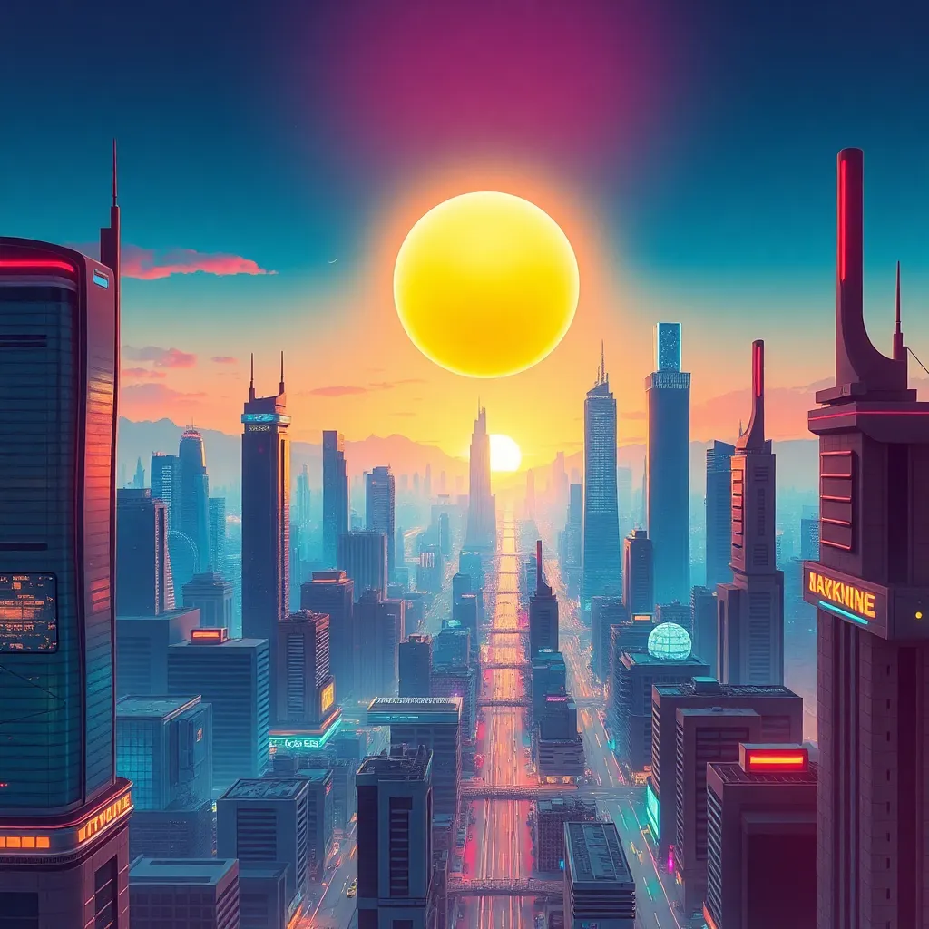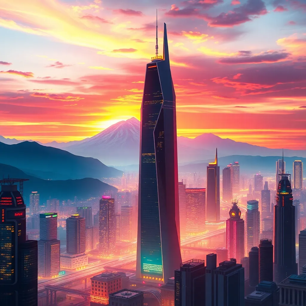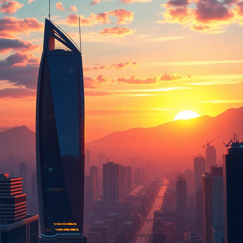 Create a futuristic cityscape at sunset, with towering skyscrapers, flying cars, and a vibrant atmosphere. Incorporate neon lights, holographic advertisements, and a bustling street scene. Use a warm color palette and blend realistic elements with sci-fi elements to create a unique and captivating image.