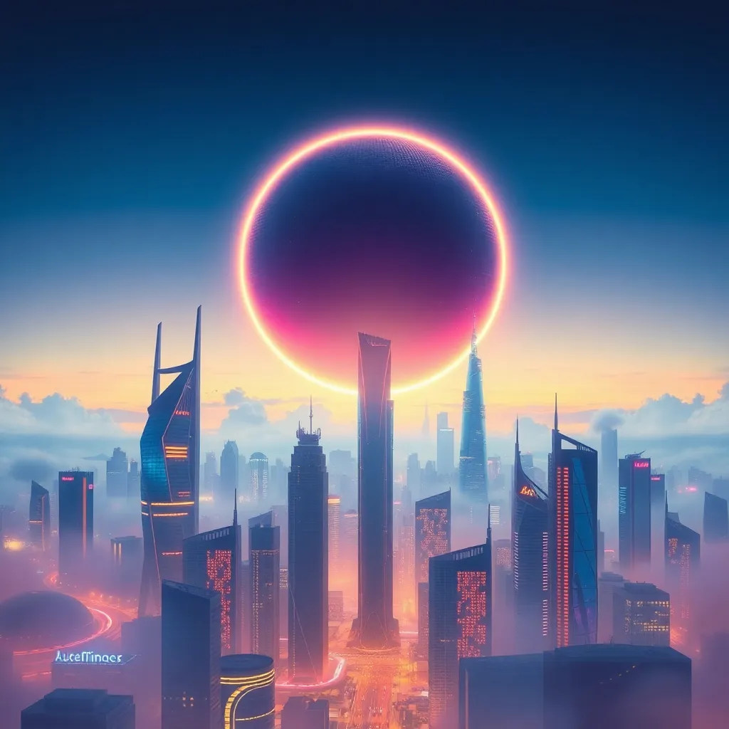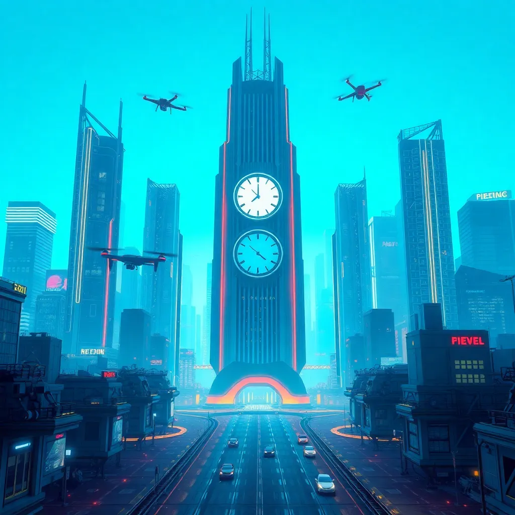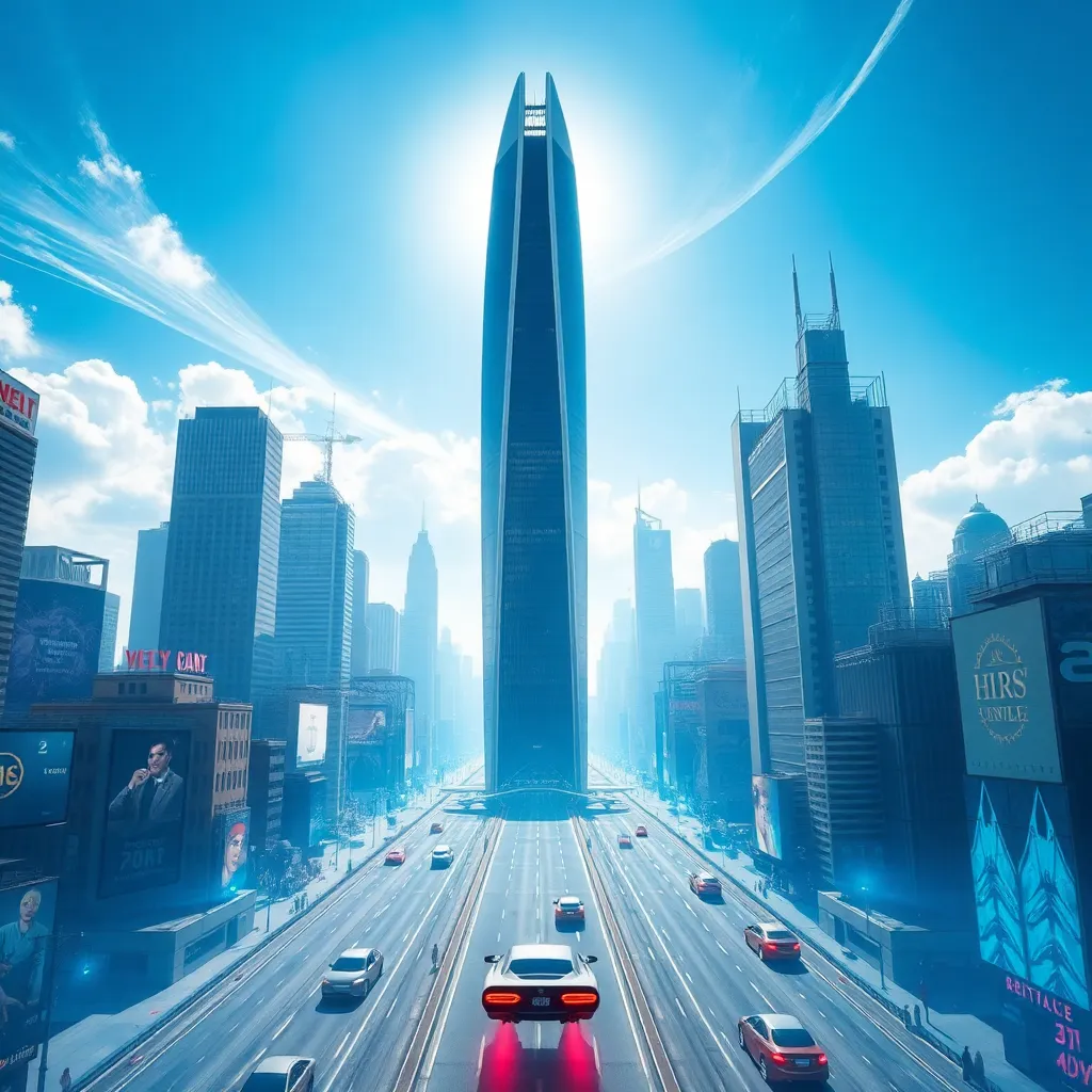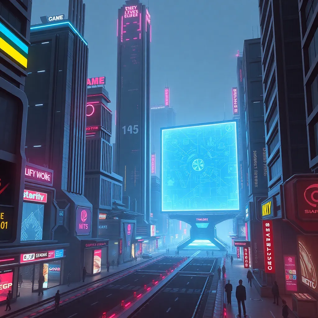 Create a futuristic cityscape with sleek skyscrapers, neon lights, and a vibrant atmosphere. Incorporate a central hub with a massive screen displaying a holographic display. Add a few flying vehicles and pedestrians walking along the streets. Use a muted color palette with pops of bright colors. Make it futuristic and dynamic.
