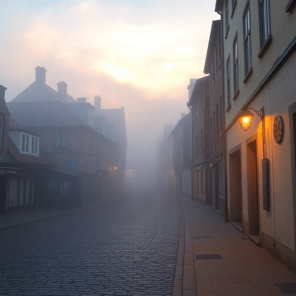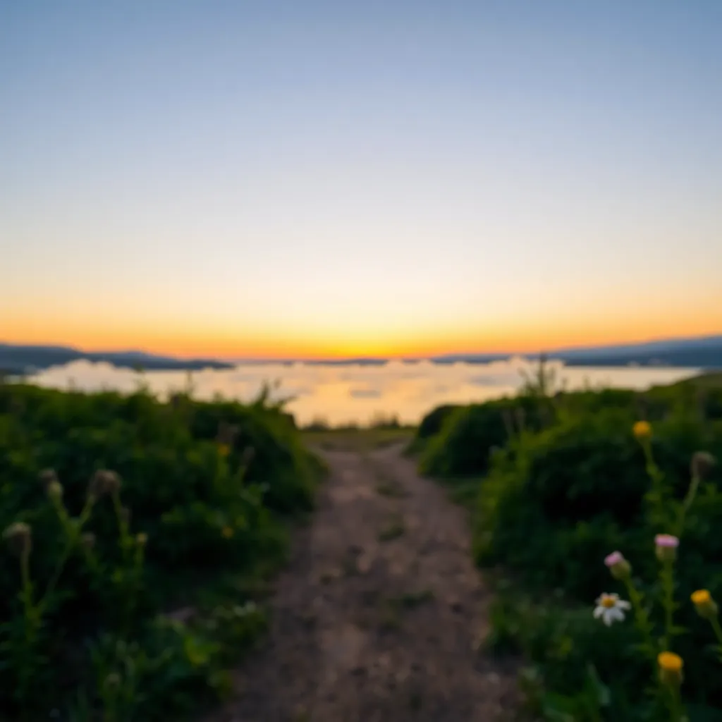 Generate a stunning sunset landscape with a blurred image of a serene lake in the background. The foreground features a winding dirt path, lush greenery, and a few scattered wildflowers. The atmosphere is warm and inviting, with a hint of mist rising from the water. Unblur the image and enhance its details.