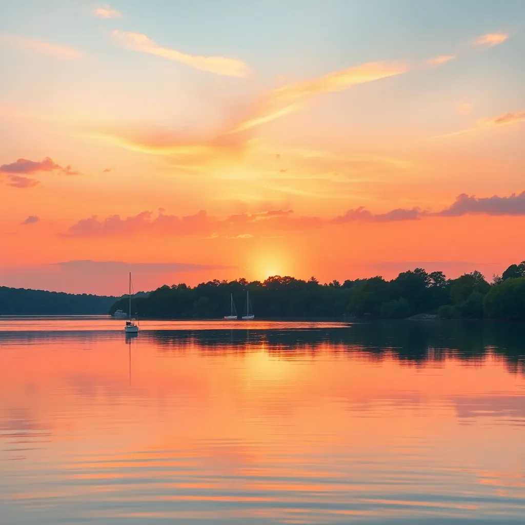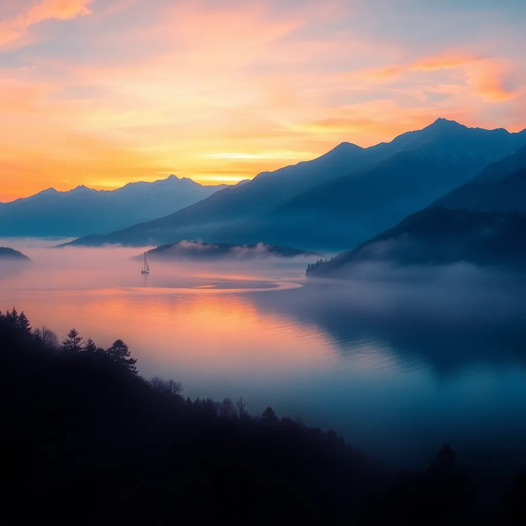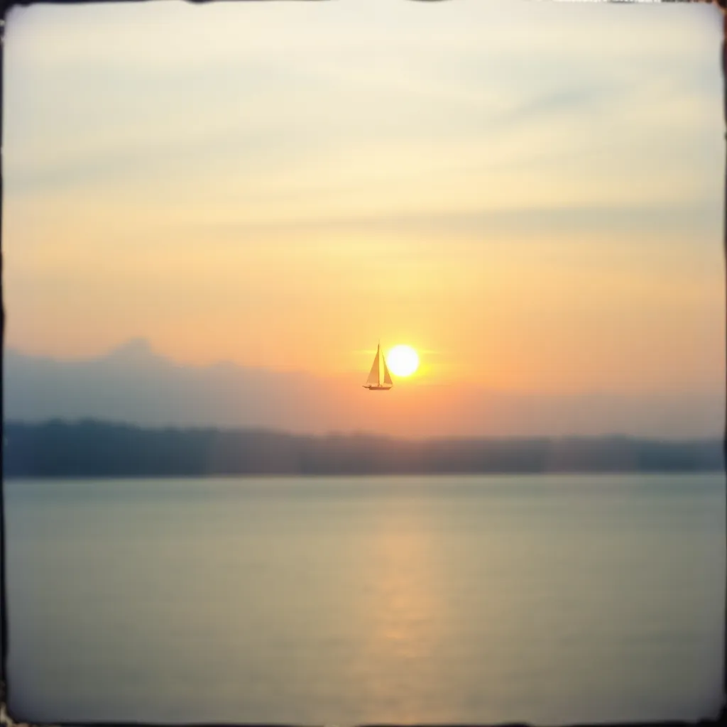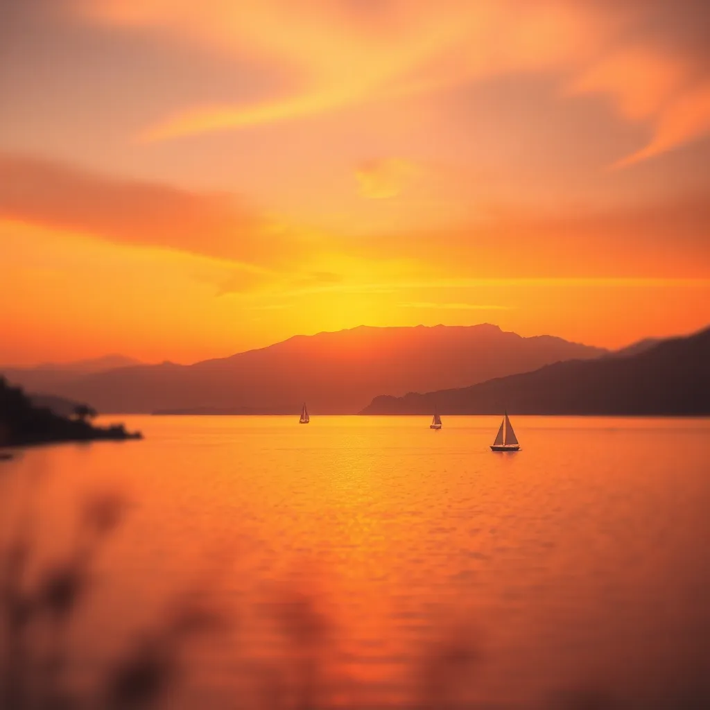 Create a stunning sunset scene over a serene lake. Imagine a warm orange glow spreading across the water, with a few sailboats gliding across the calm surface. In the distance, a majestic mountain range rises up, its peaks shrouded in a gentle mist. Blend the soft focus of a blurred image with vibrant colors and textures.