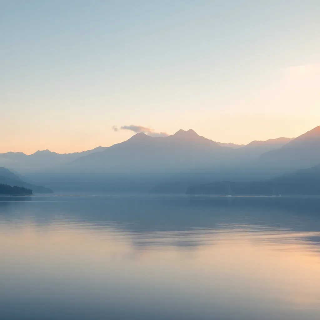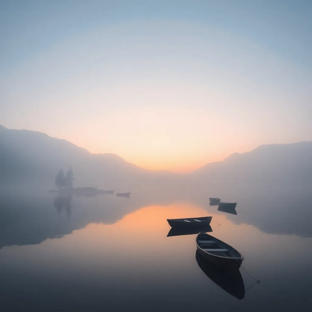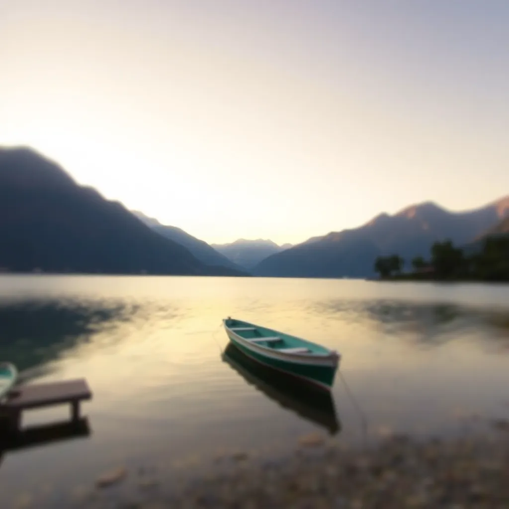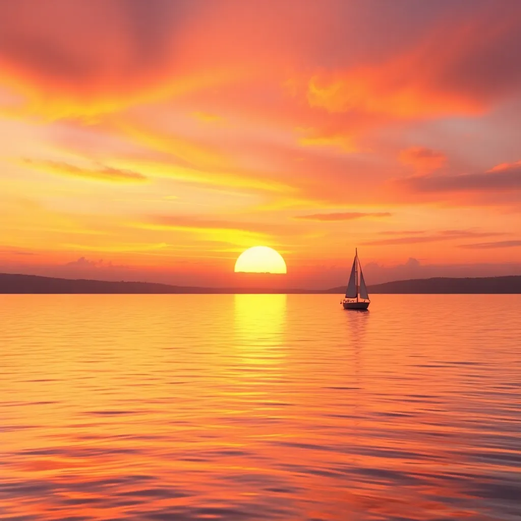Create a stunning sunset scene over a serene lake. Imagine a warm orange glow spreading across the water, with a few sailboats gliding across the calm surface. In the distance, a majestic mountain range rises up, its peaks shrouded in a gentle mist. Blend the soft focus of a blurred image with vibrant colors and textures.