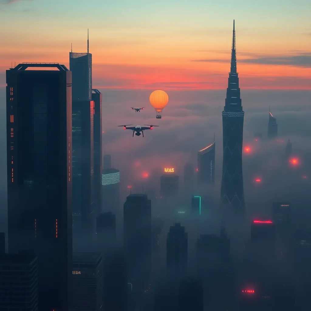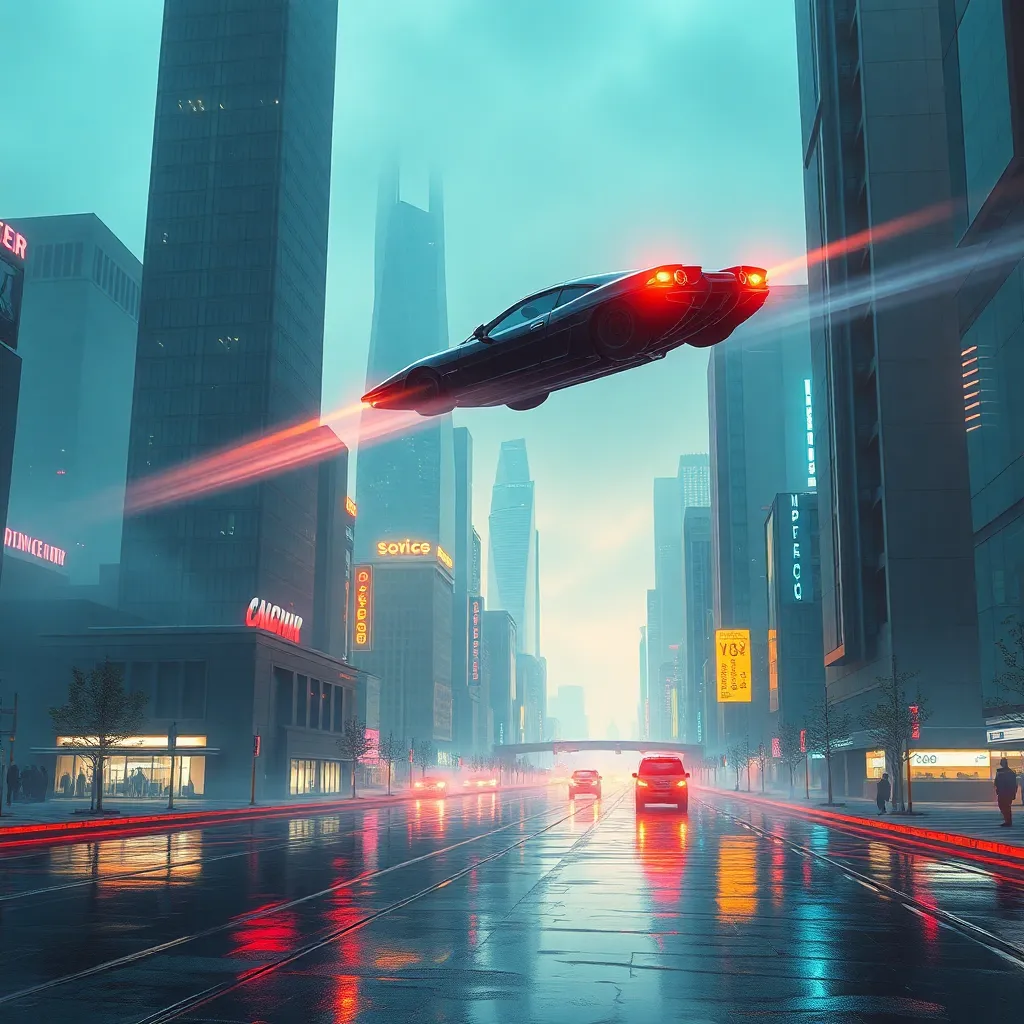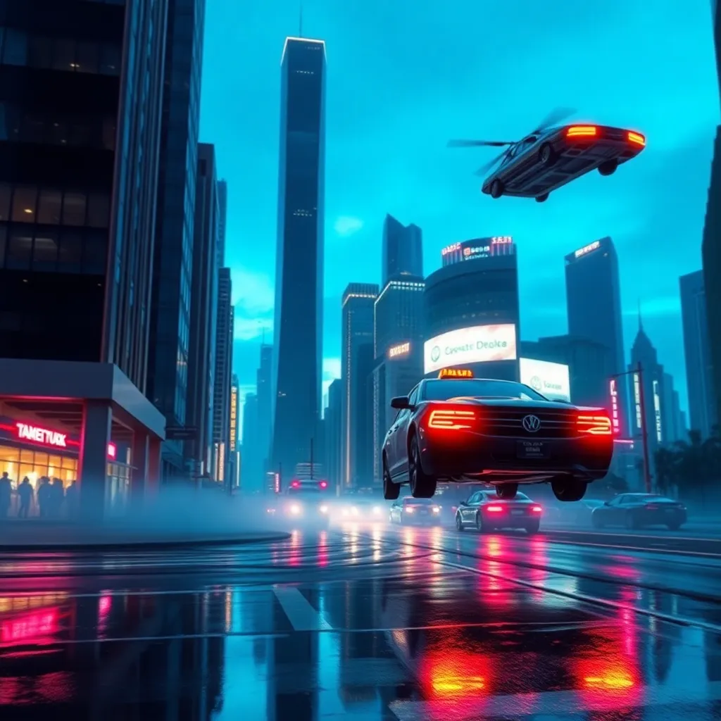 Create an futuristic cityscape at dusk, with sleek skyscrapers and neon lights reflecting off the wet pavement. Incorporate a flying taxi hovering above the street, with a subtle mist rising from the ground. Add a sense of movement and energy to the scene, with vibrant colors and a dynamic atmosphere.