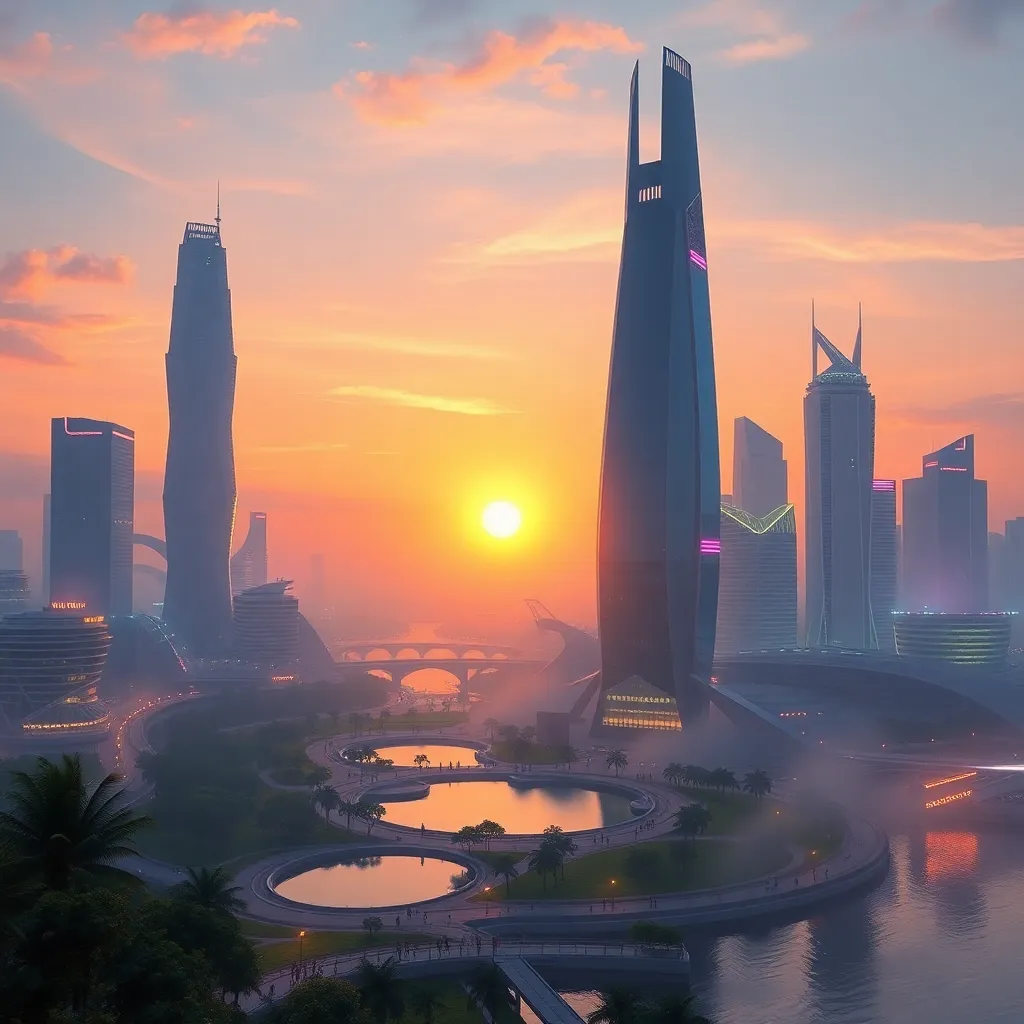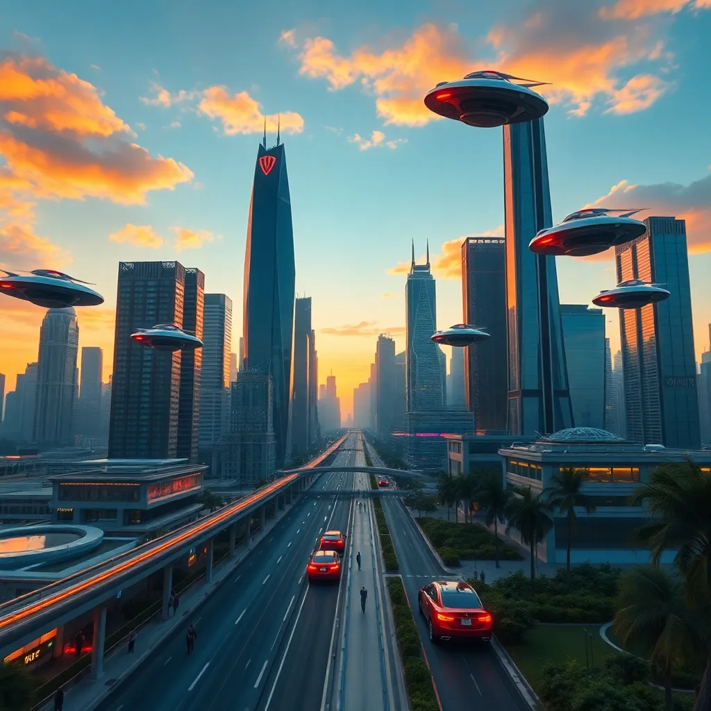 Generate a futuristic cityscape with sleek skyscrapers and flying cars zipping by. The city should be set at sunset, with a warm orange glow illuminating the buildings. Include a few people walking along the streets, and add some greenery and water features to the scene. Make the image high-contrast and vibrant.